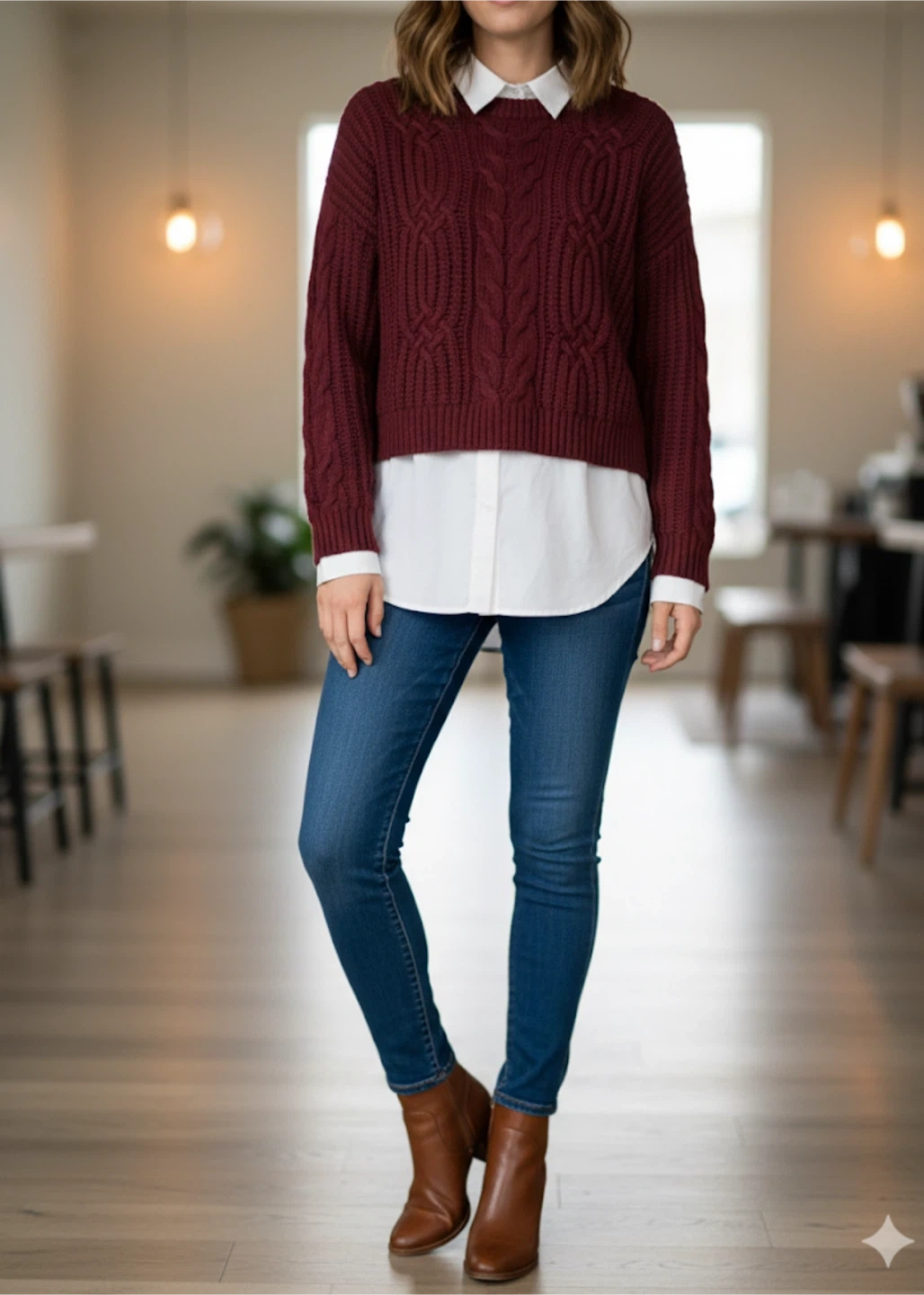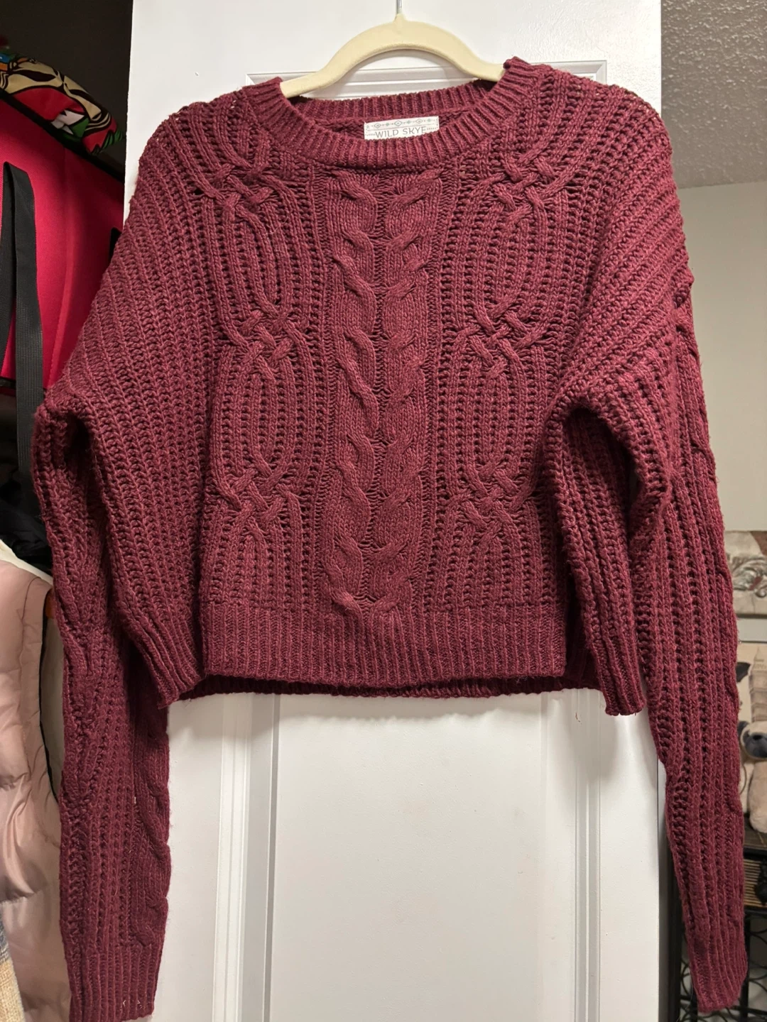 This Wild Sky cable knit sweater is a stylish burgundy colour. It's a cropped style with long sleeves. This sweater is perfect for layering or wearing on its own for a cozy look!