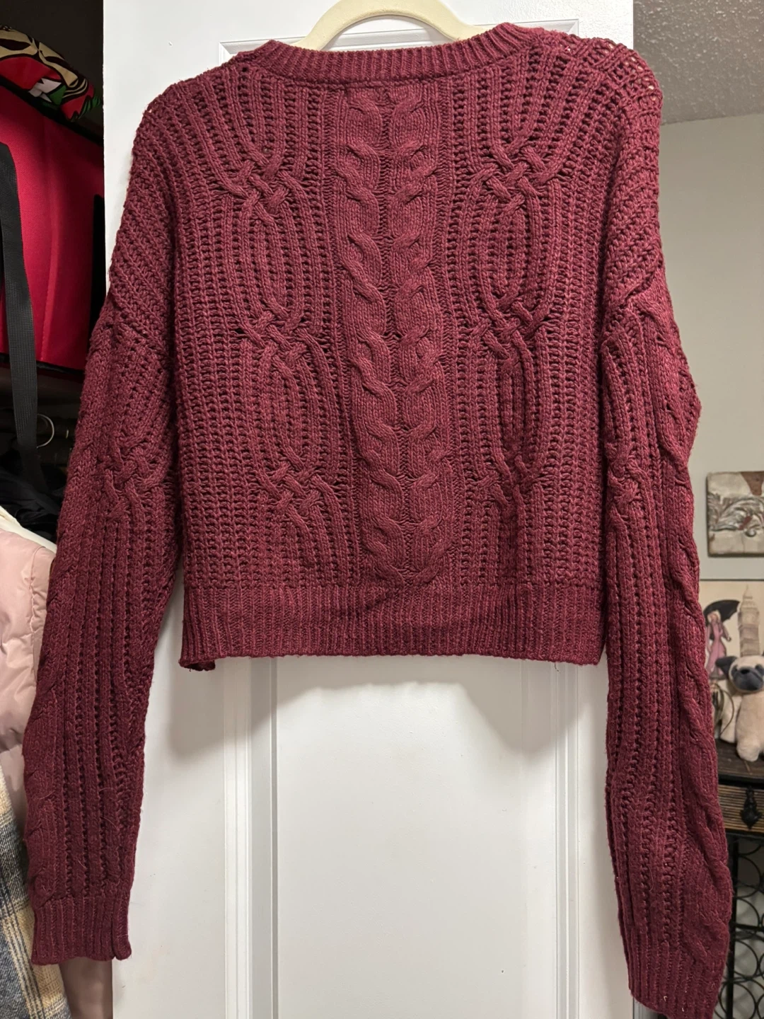 This Wild Sky cable knit sweater is a stylish burgundy colour. It's a cropped style with long sleeves. This sweater is perfect for layering or wearing on its own for a cozy look!