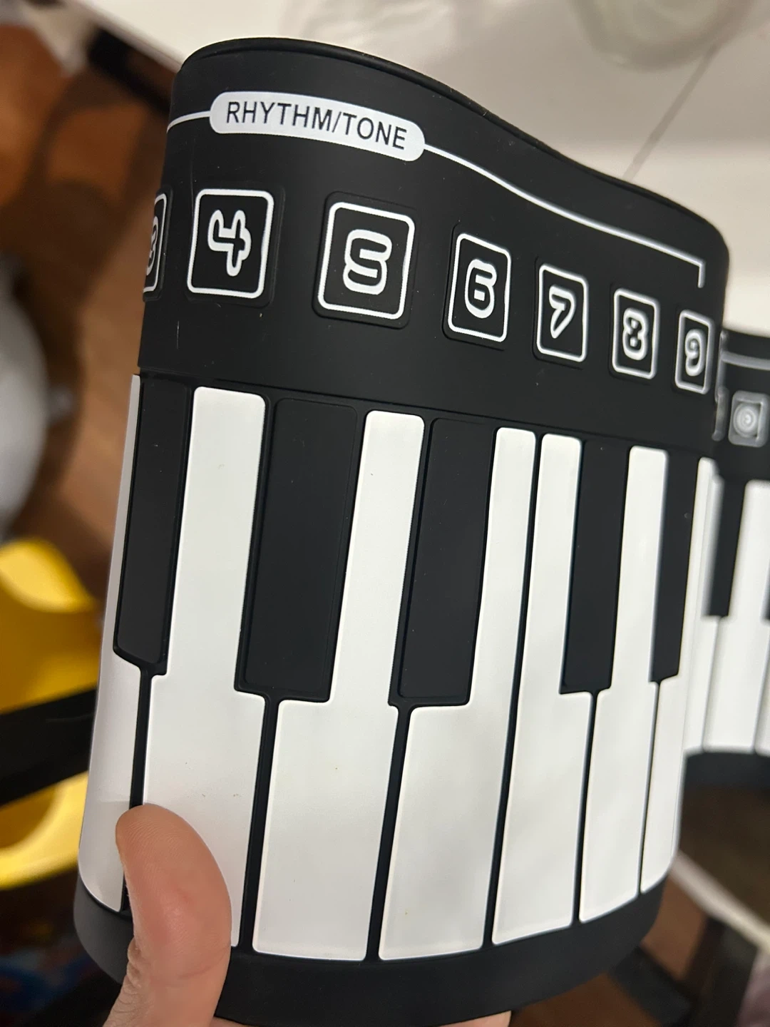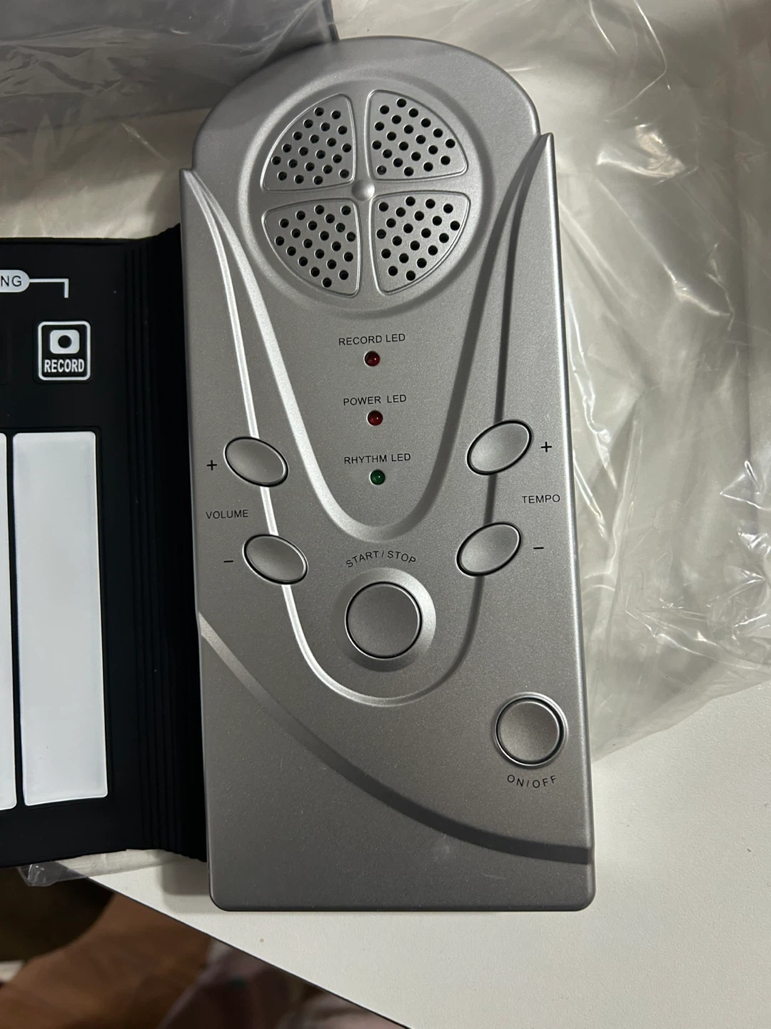 This is a roll-up electronic keyboard, ideal for on-the-go music practice. It features volume and tempo controls with a built-in speaker. A record function is also included.
