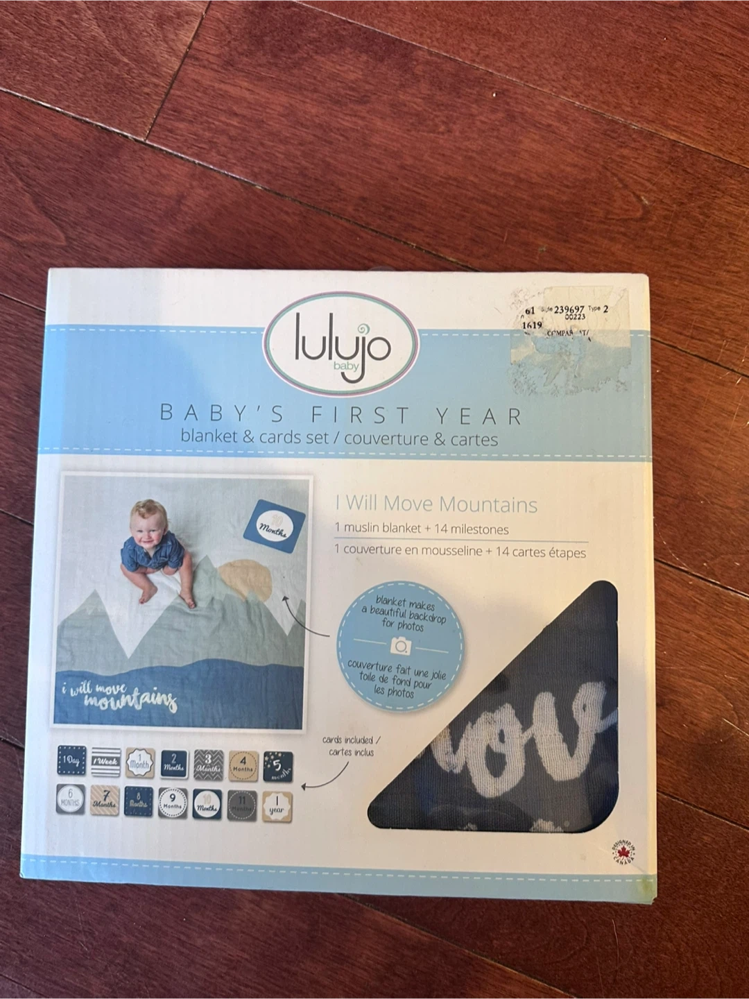 This is a Lulujo Baby's First Year blanket and cards set. It includes 1 muslin blanket and 14 milestone cards. The blanket can be used as a photo backdrop.