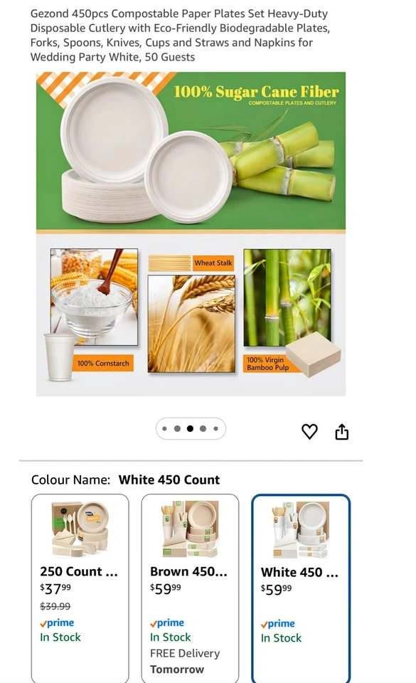 4 boxes available. $10 each. Pickup in Ocean Park, Surrey near 20 Ave and 134 Street. Eco-friendly disposable set with 450 pieces total, serving 50 guests. Includes heavy-duty compostable plates (7-inch and 9-inch), forks, spoons, knives, cups, straws, and napkins. Made from sugar cane fiber, cornstarch, wheat stalk, and bamboo pulp. Great for parties or events.