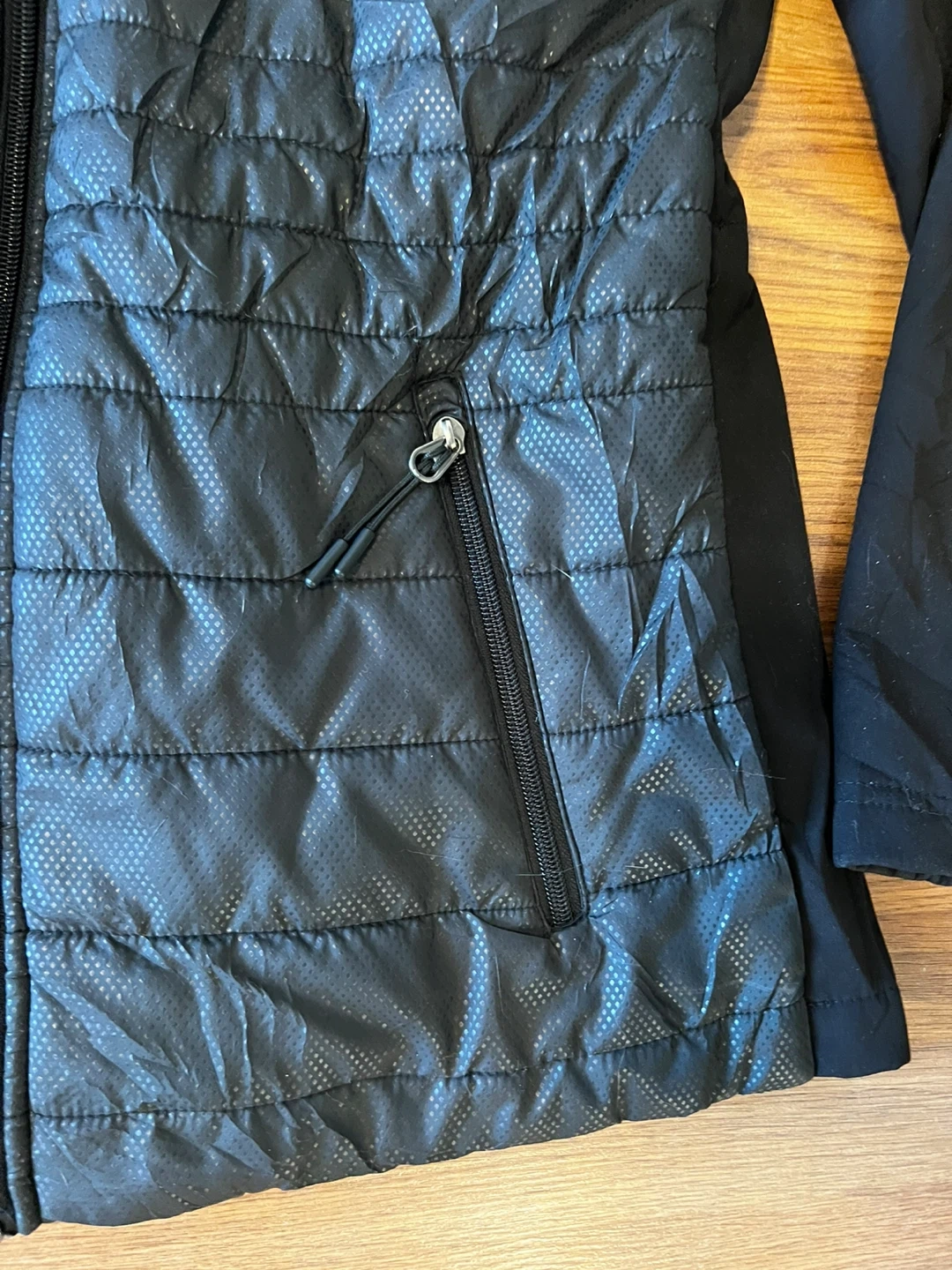 Design: A full-zip hybrid design featuring a quilted, insulated front panel for warmth and soft-shell sleeves for better mobility.