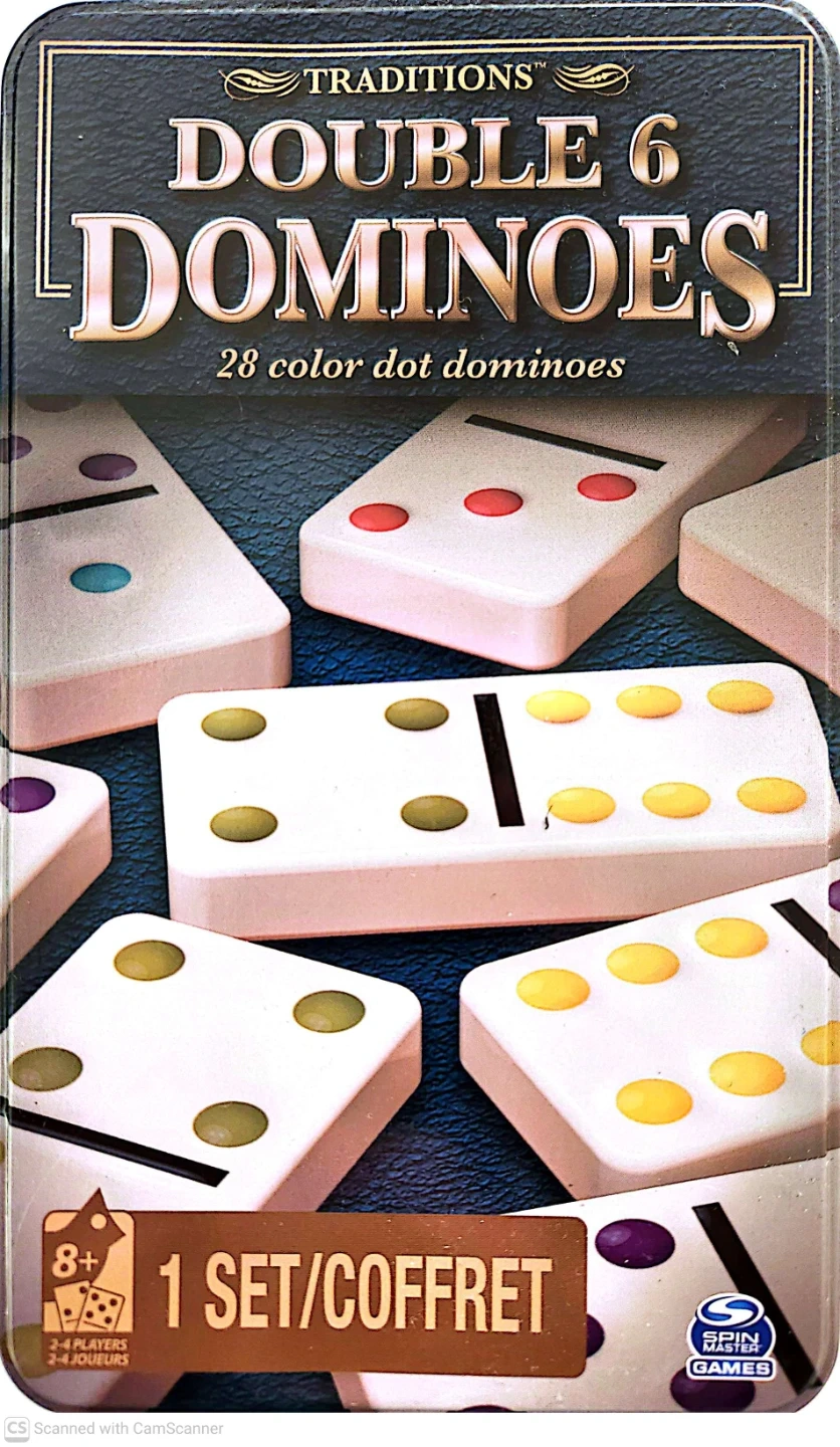 This is a Traditions Double 6 Dominoes set featuring 28 color dot dominoes. It's recommended for ages 8+ and for 2-4 players. The set includes 1 set/coffret.