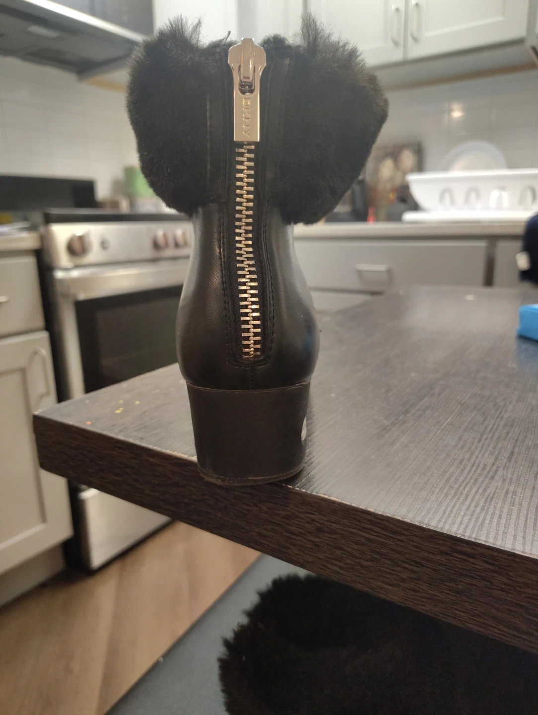 DKNY Leather Zipper boots with fur trim. They feature a convenient back zipper closure and able wedge heel. These boots are stylish and practical for cooler weather!