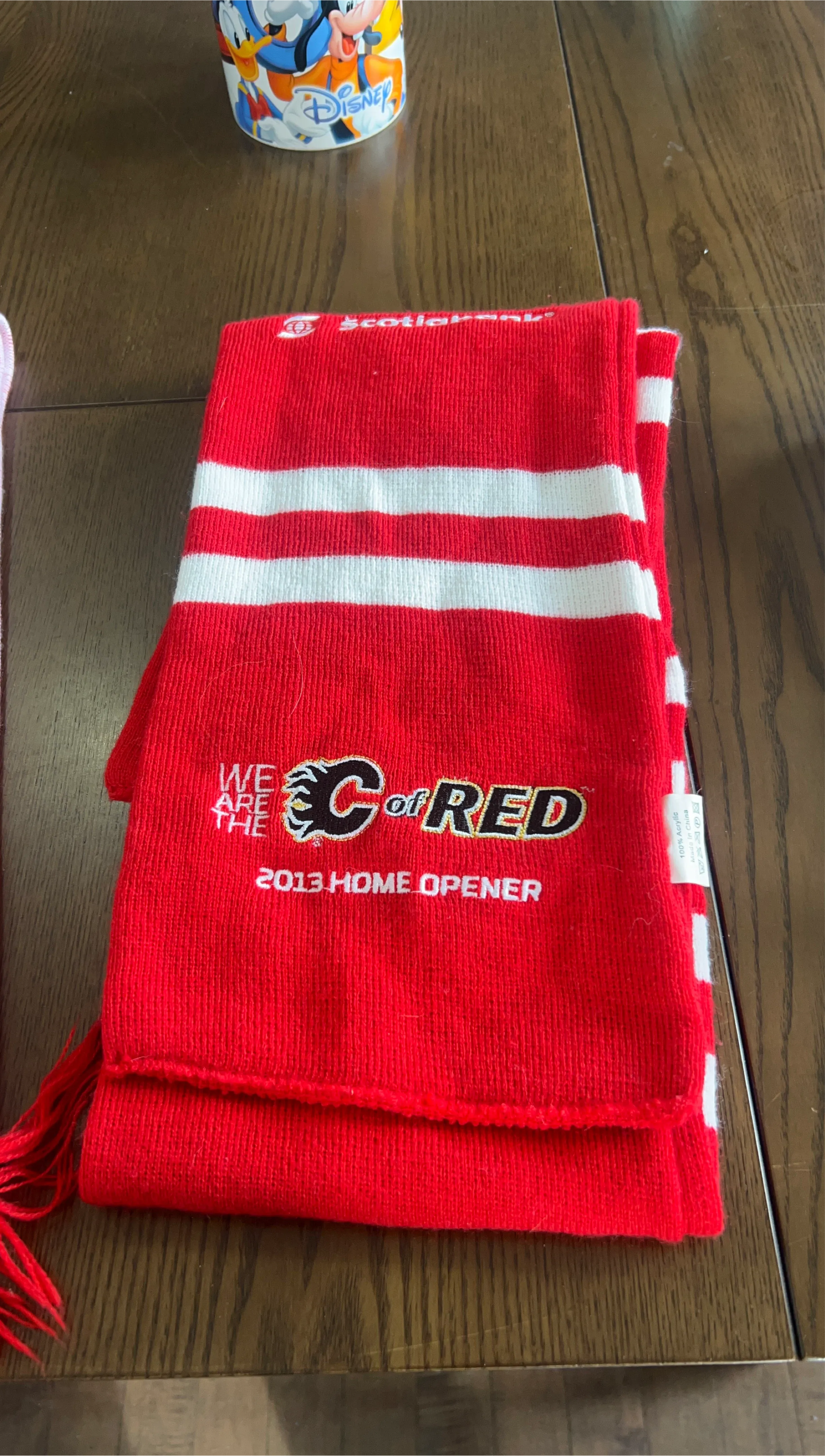 This is a red knitted scarf celebrating the Calgary Flames' 2013 Home Opener. It's made of 100% acrylic. The scarf features white stripes and "WE ARE THE C of RED" text. It's a great way to show your team spirit!