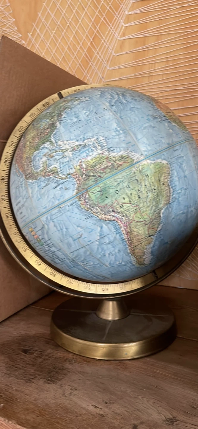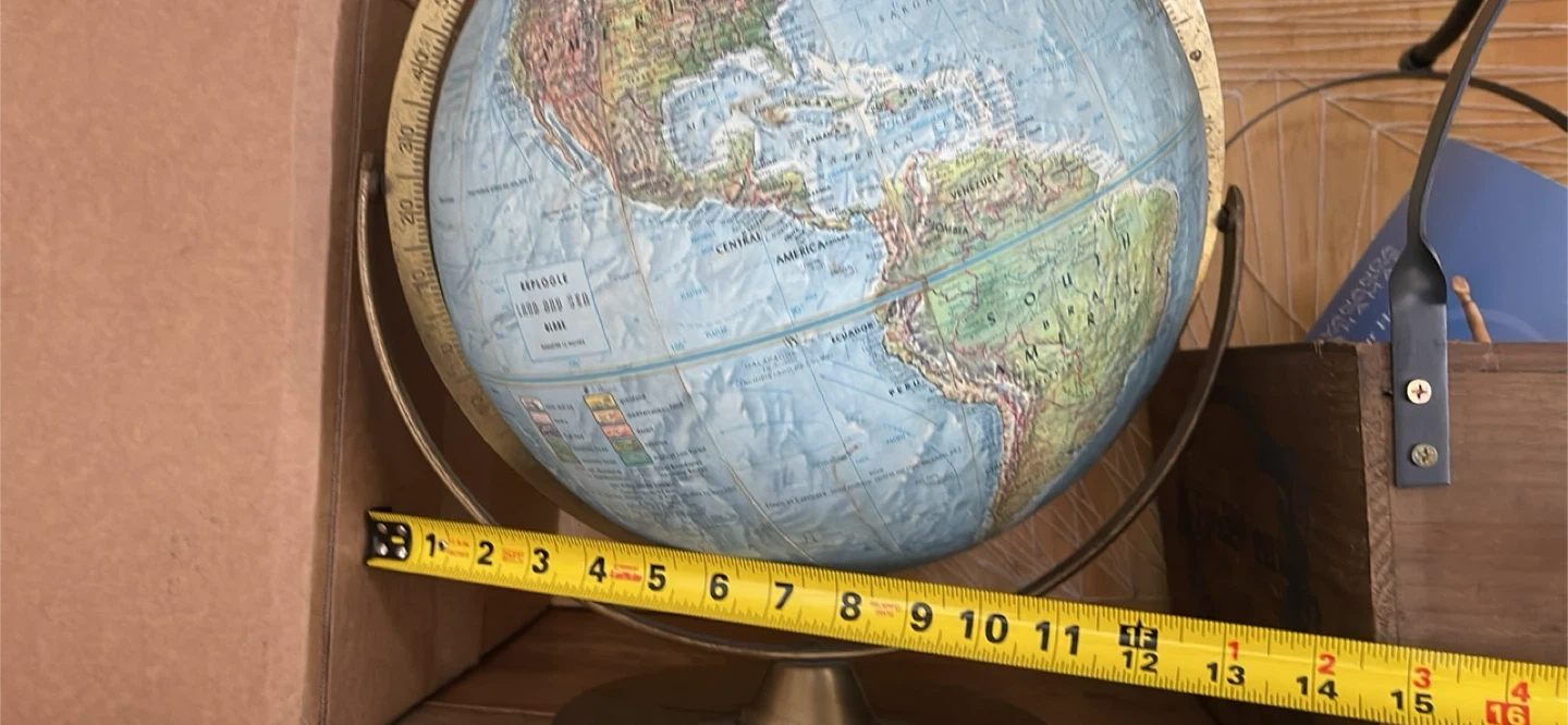 A classic globe with a sturdy metal stand. It measures approximately 12 inches in height. The globe displays continents and oceans clearly.