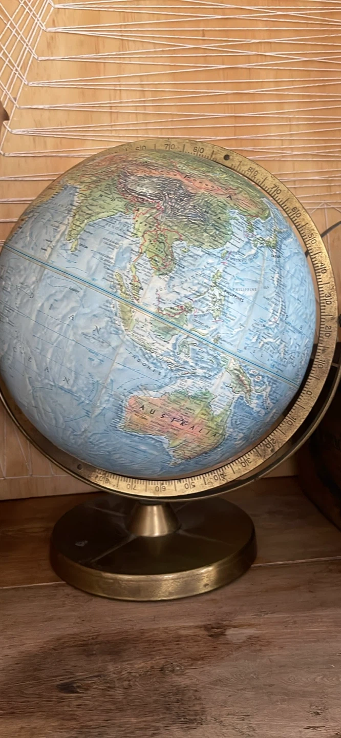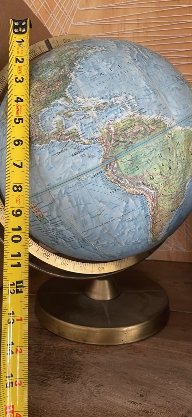 A classic globe with a sturdy metal stand. It measures approximately 12 inches in height. The globe displays continents and oceans clearly.