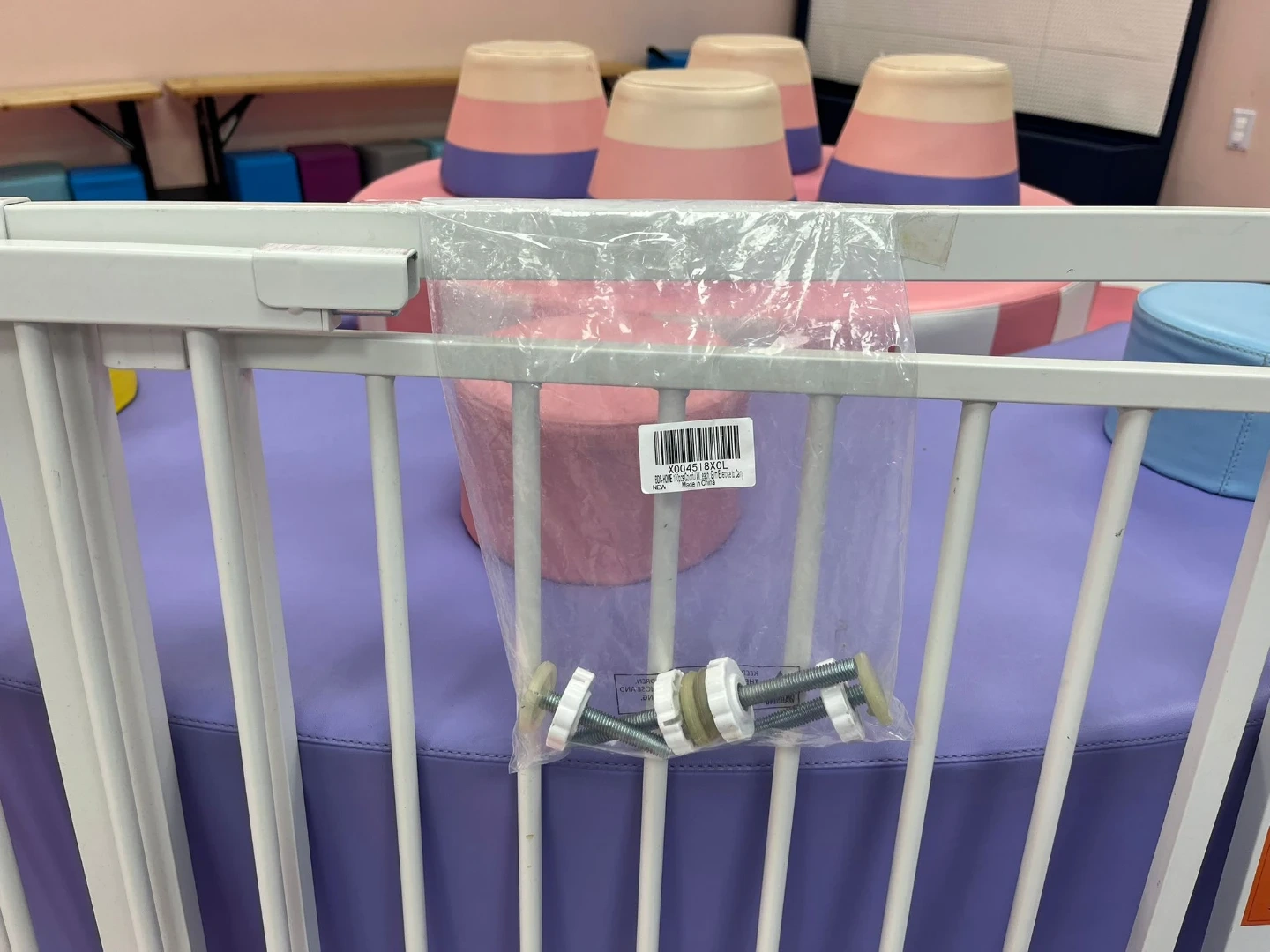 This is a white metal baby gate. It's a pressure-mounted style with a walk-through door. Includes hardware for installation. Suitable for doorways and staircases.