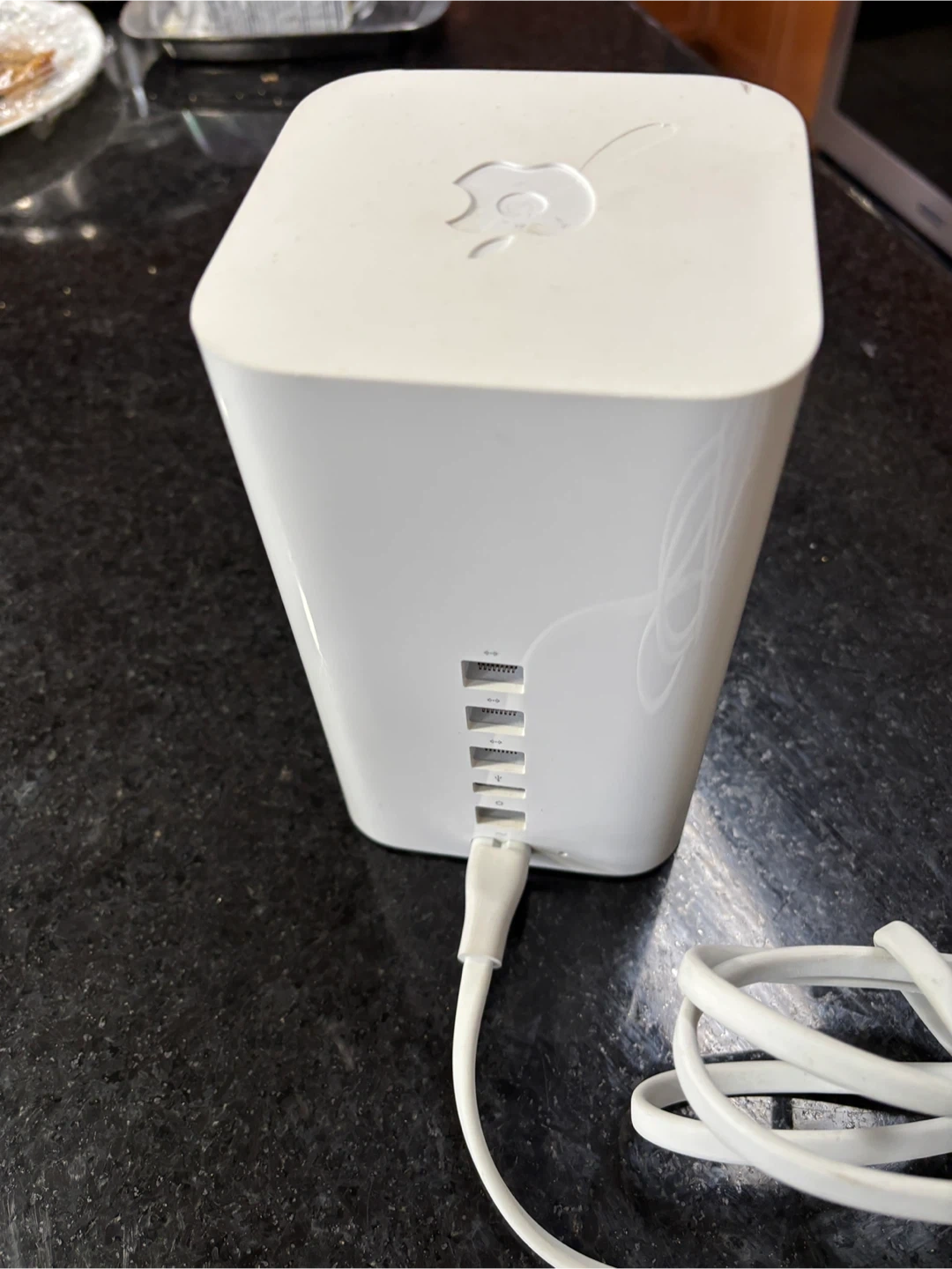 This is an Apple AirPort Extreme Base Station, model A1521. It's white and has several ports on the back. Connect your devices and expand your network!