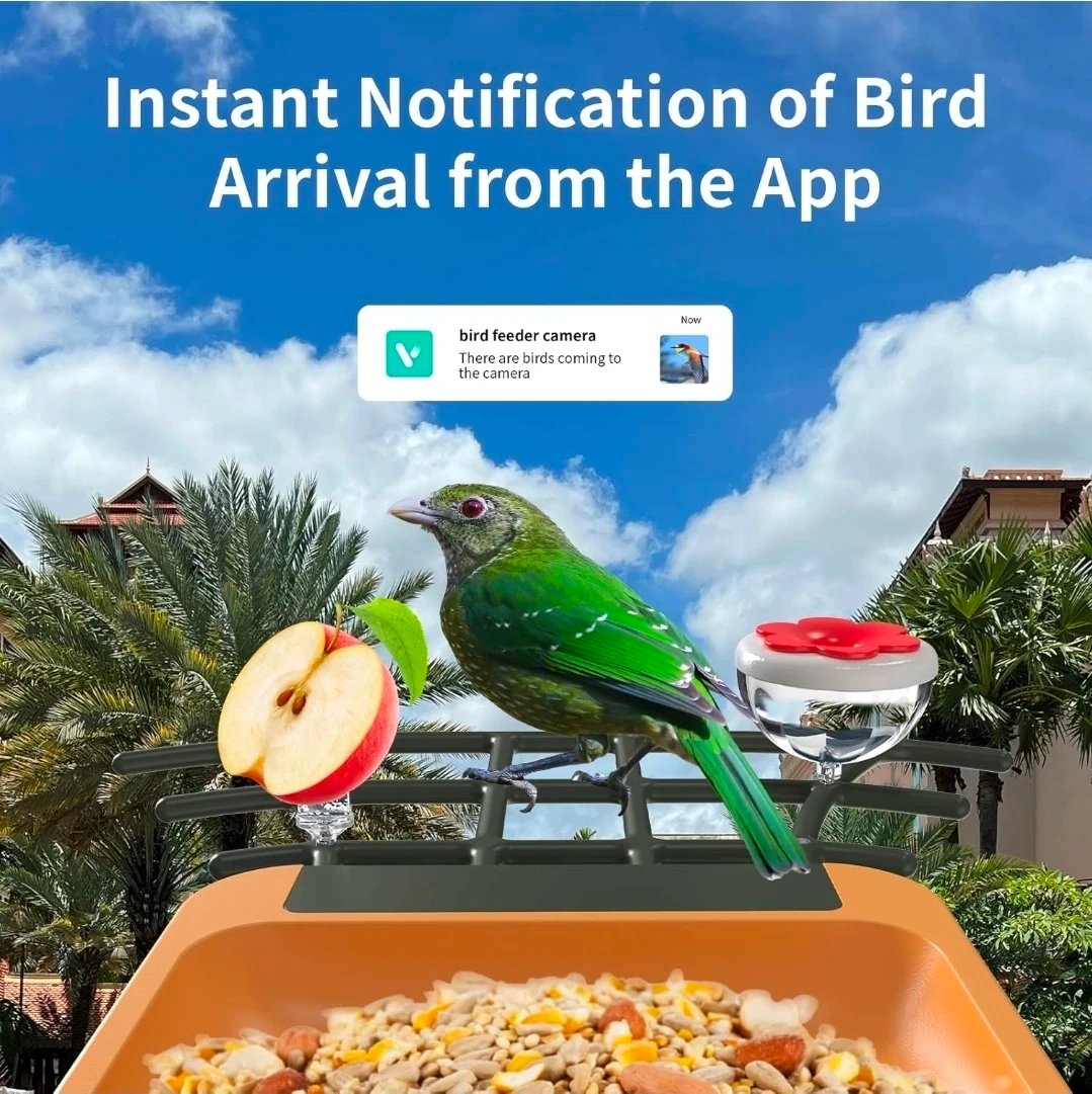 This solar-powered bird feeder includes a 2K high-definition camera with a wide 140-degree angle, PIR infrared, and full-color night vision. It's powered by a 5000mAh rechargeable battery and connects to an app for instant notifications. The feeder identifies over 10,000 species of birds! It's great for watching birds in your backyard.