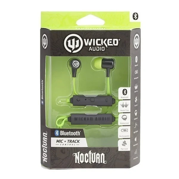 These Wicked Audio Nocturn earbuds connect wirelessly via Bluetooth. They feature mic and track control for easy management of calls and music. The earbuds are rechargeable.