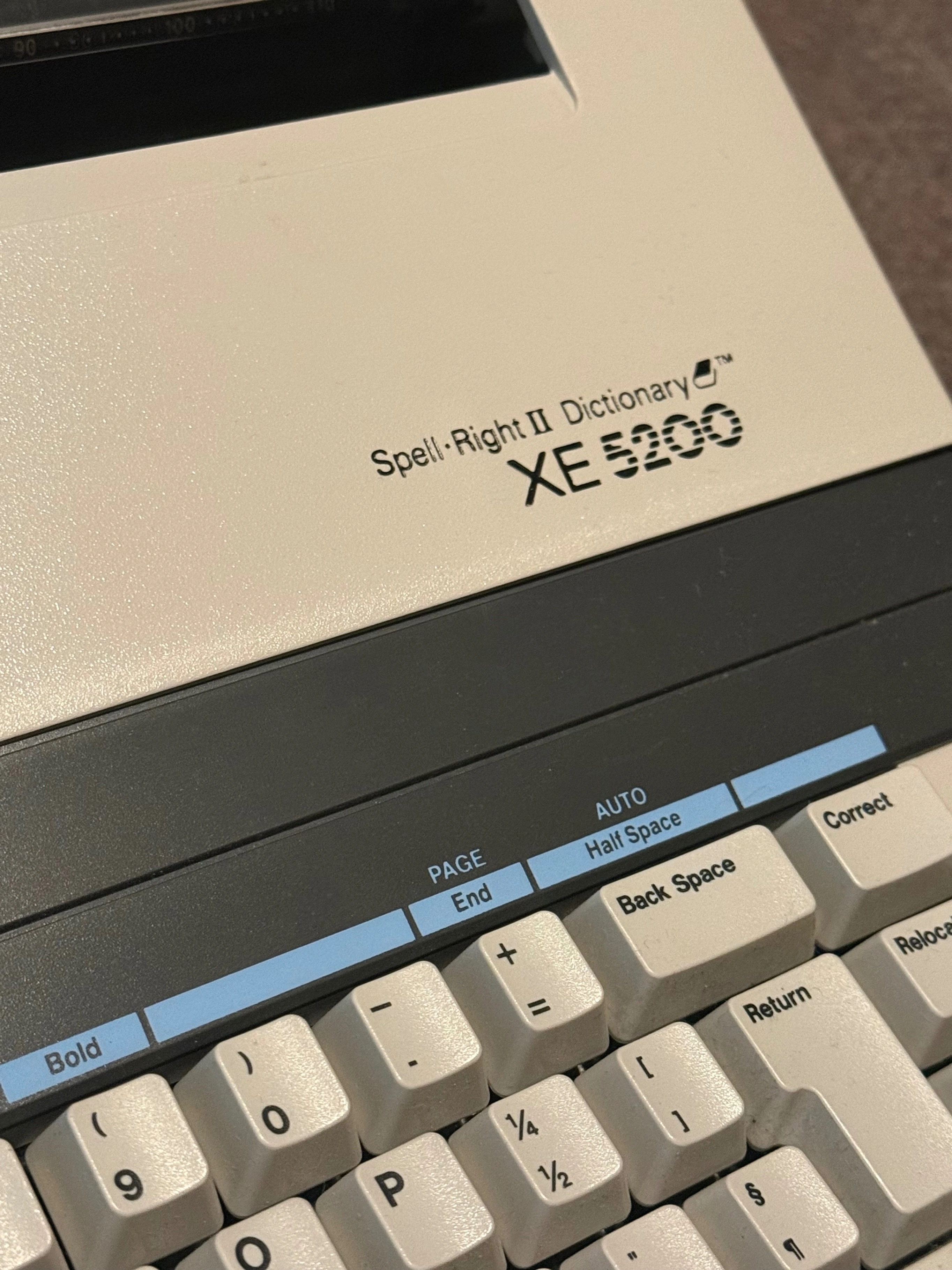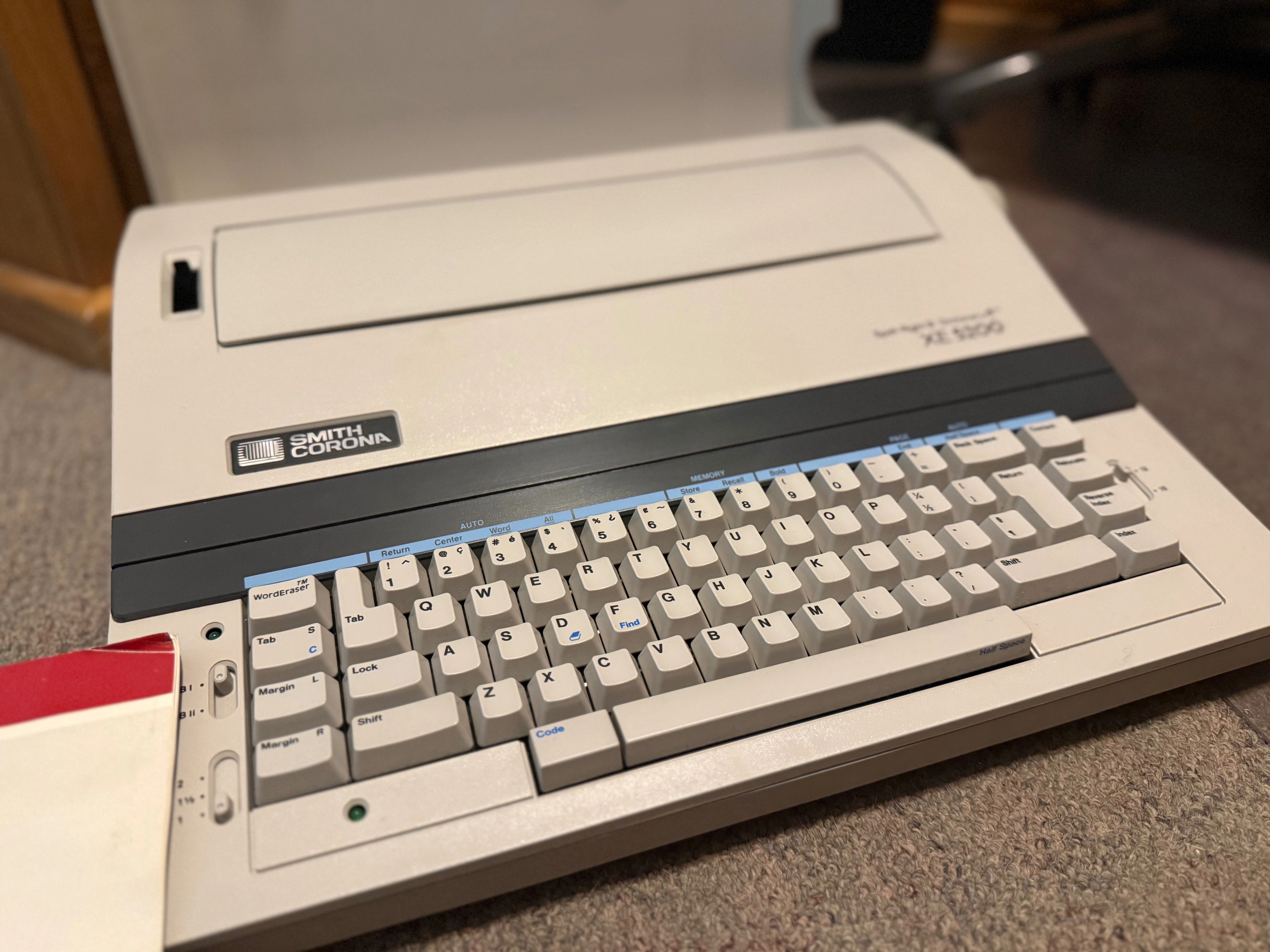 The Smith Corona XE5200 is a vintage electric typewriter featuring advanced-for-its-time technology, most notably the Spell-Right II electronic dictionary and spell-check, a 5,000-character editable memory for text storage/correction, and correction features like WordEraser™. Part of Smith Corona's electronic line, it offered functions such as auto-return, auto-center, dual pitch, and a find feature, bridging the gap between traditional typing and modern word processing.