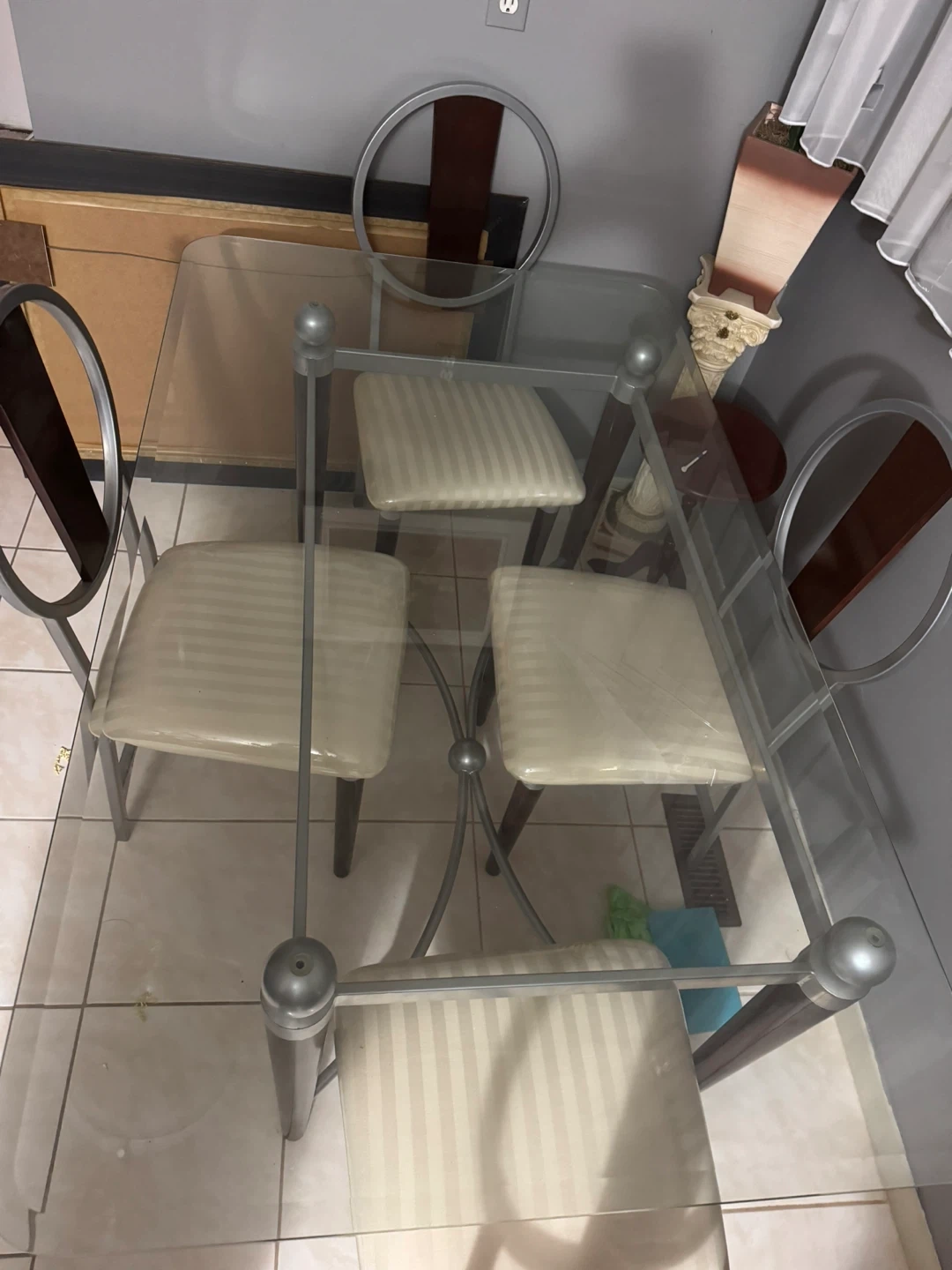 This is a stylish glass dining table set complete with four cushioned chairs. The chairs are upholstered in a cream-coloured fabric with subtle vertical stripes. It's a great set for smaller dining areas!