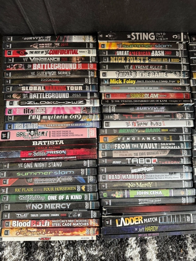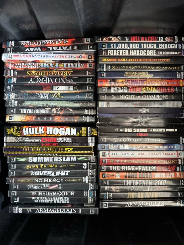 Huge WWE / Wrestling collection: 2 totes full of DVDs (including TNA, etc.), a binder with around 1,000 cards, and a box of sealed Elite/older figures. Selling the entire lot for $2,000 firm. Easily valued over $5,000. Serious interest only. Thank you.