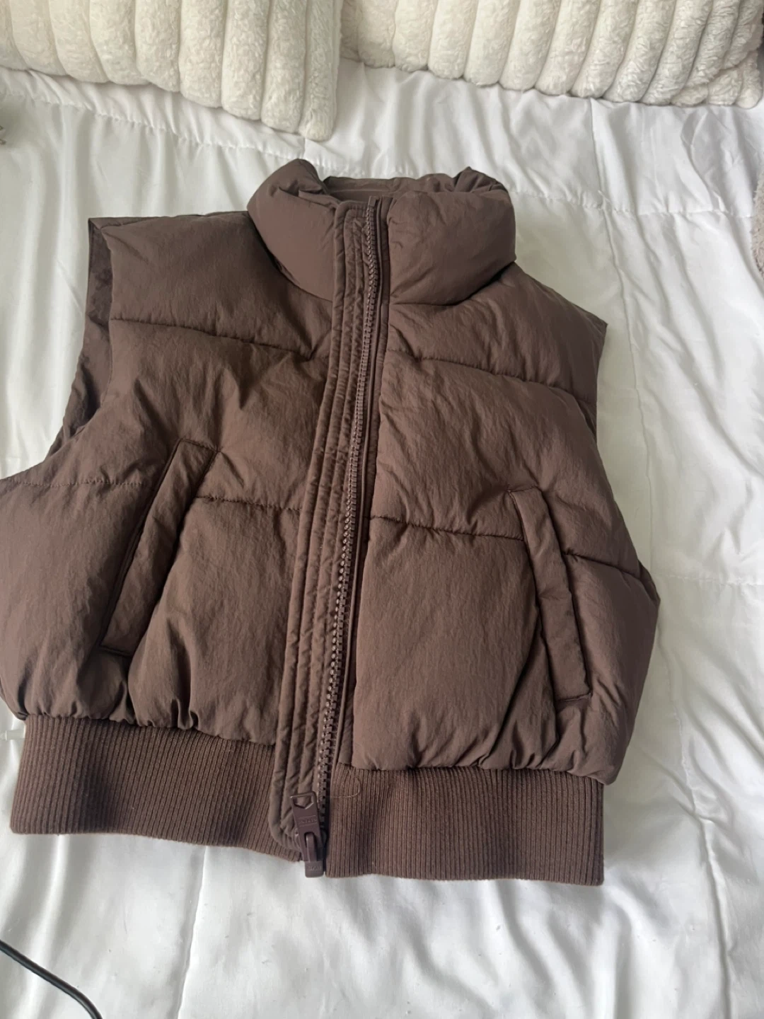 This is a brown, cropped puffer vest. Retails for $80. It features a zip-up front and a stand-up collar. The vest is made of a water-resistant material and has two side pockets. Great for layering during cooler weather!