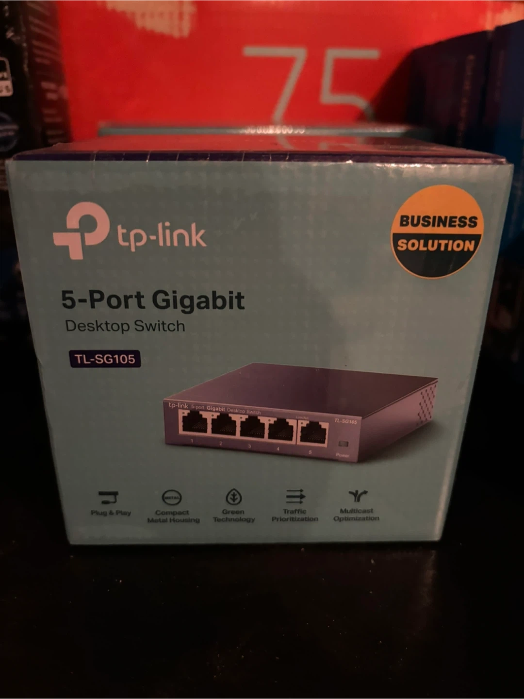 This is a TP-Link 5-Port Gigabit Desktop Switch, model TL-SG105. It's a Plug & Play device with a compact metal housing. Features Green Technology and Traffic Prioritization. Offers Multicast Optimization.