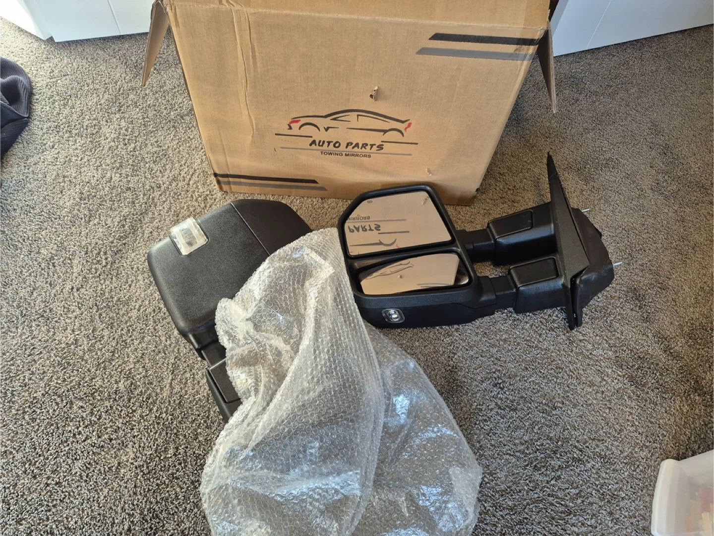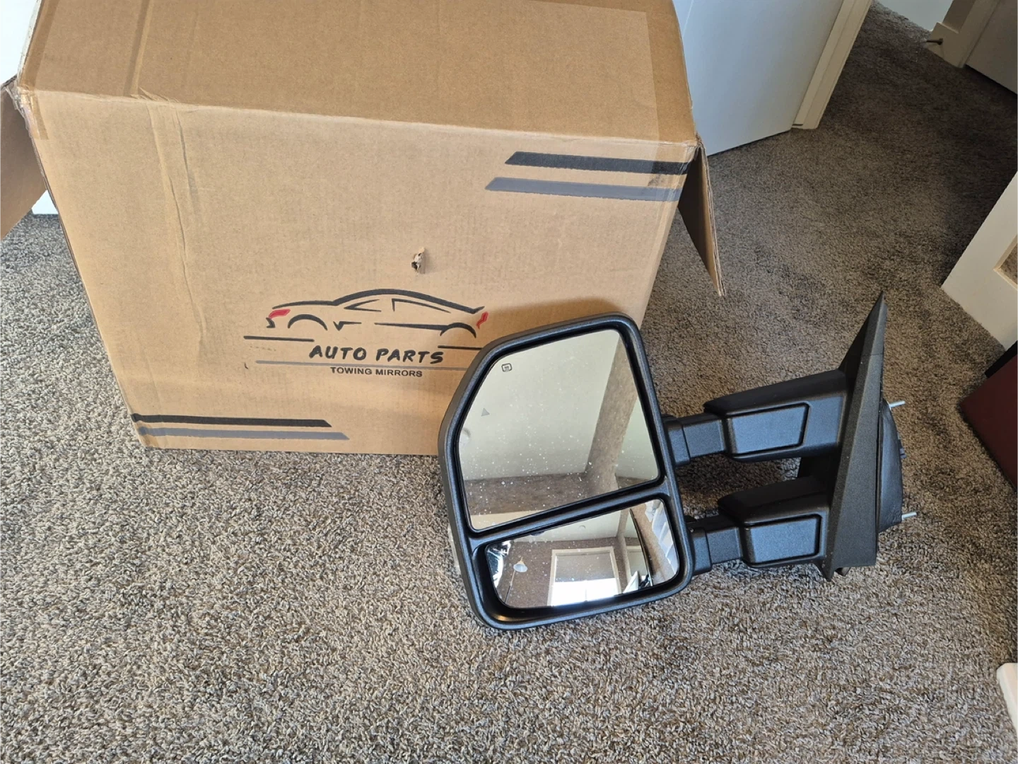 Set of towing mirrors for a Ford truck. Includes original box. These mirrors offer extended visibility for towing. It's a direct replacement for your original mirrors.