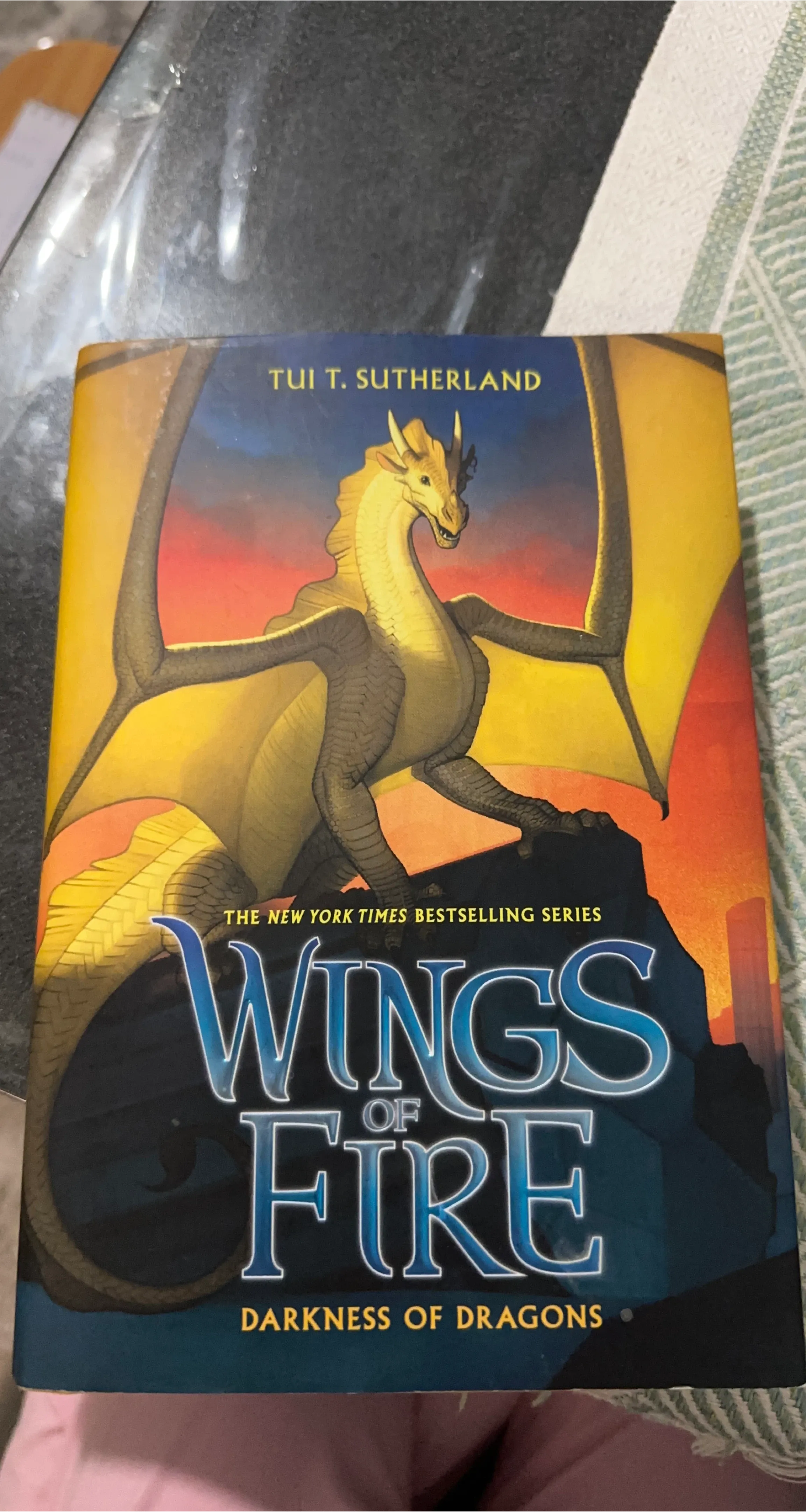 This is the book Darkness of Dragons, part of the New York Times bestselling Wings of Fire series. It's written by Tui T. Sutherland. Fans of dragon stories will love this.