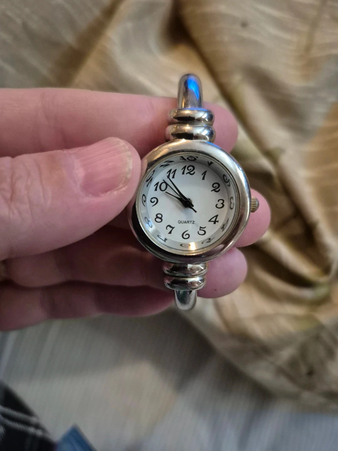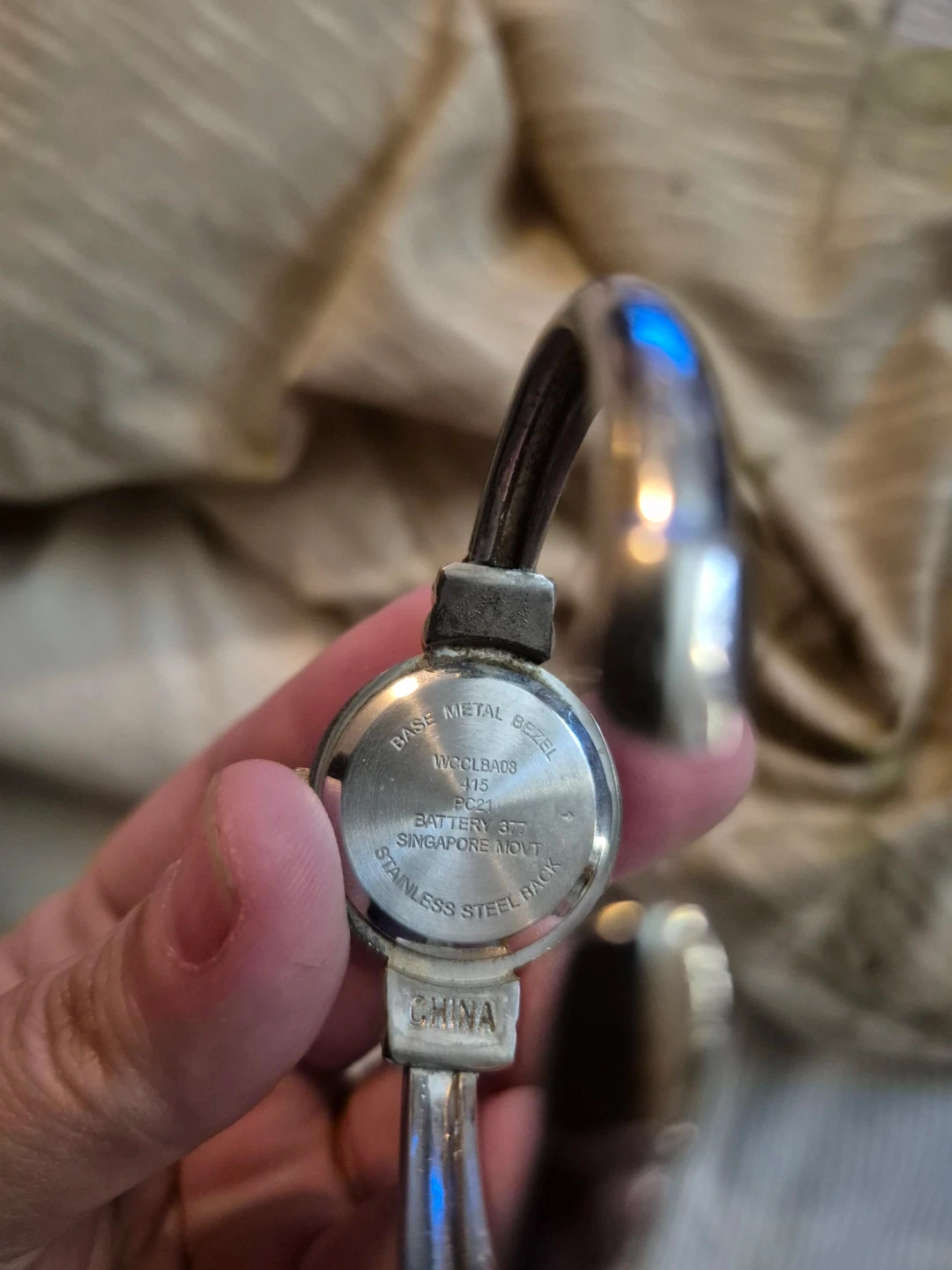 This women's quartz bangle watch has a silver-tone base metal bezel and stainless steel back. It's a cuff-style watch with a white face and black Arabic numerals. It's great for everyday wear! Will need New Battery