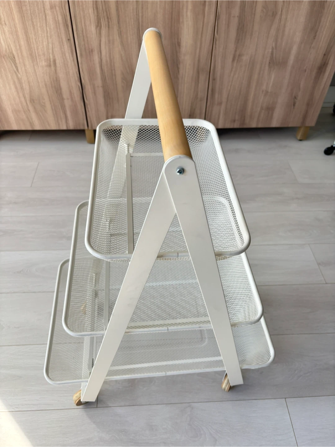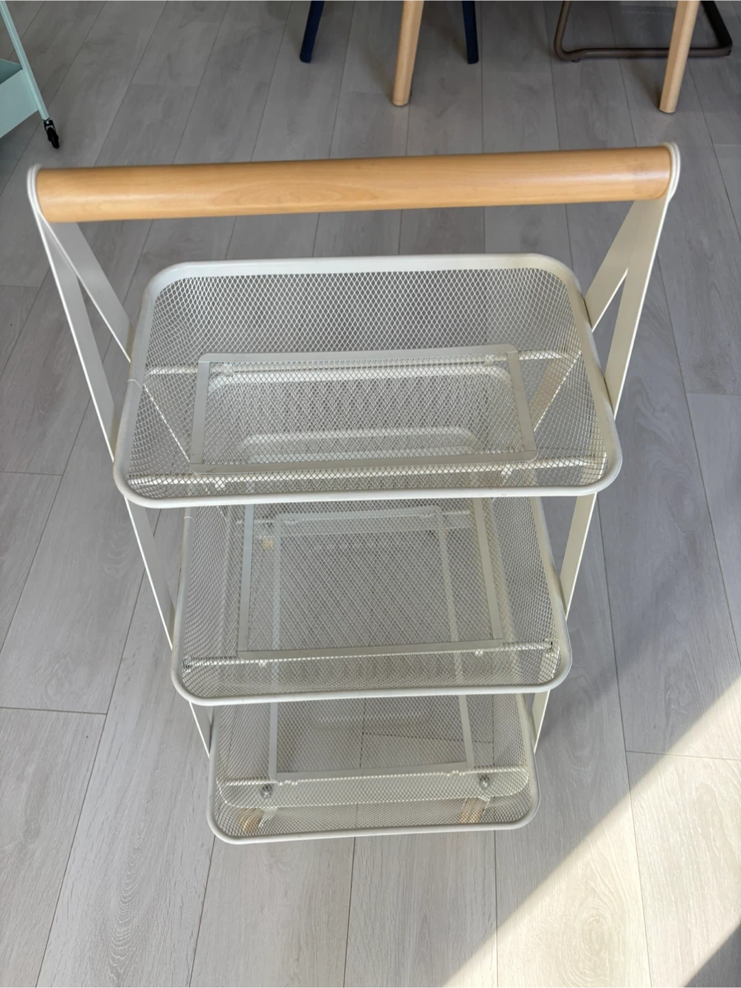 White 3-tier mesh rolling cart with a natural wood handle. Basket-style shelves. Baskets have signs of wear and tear, but doesn’t affect functionality.