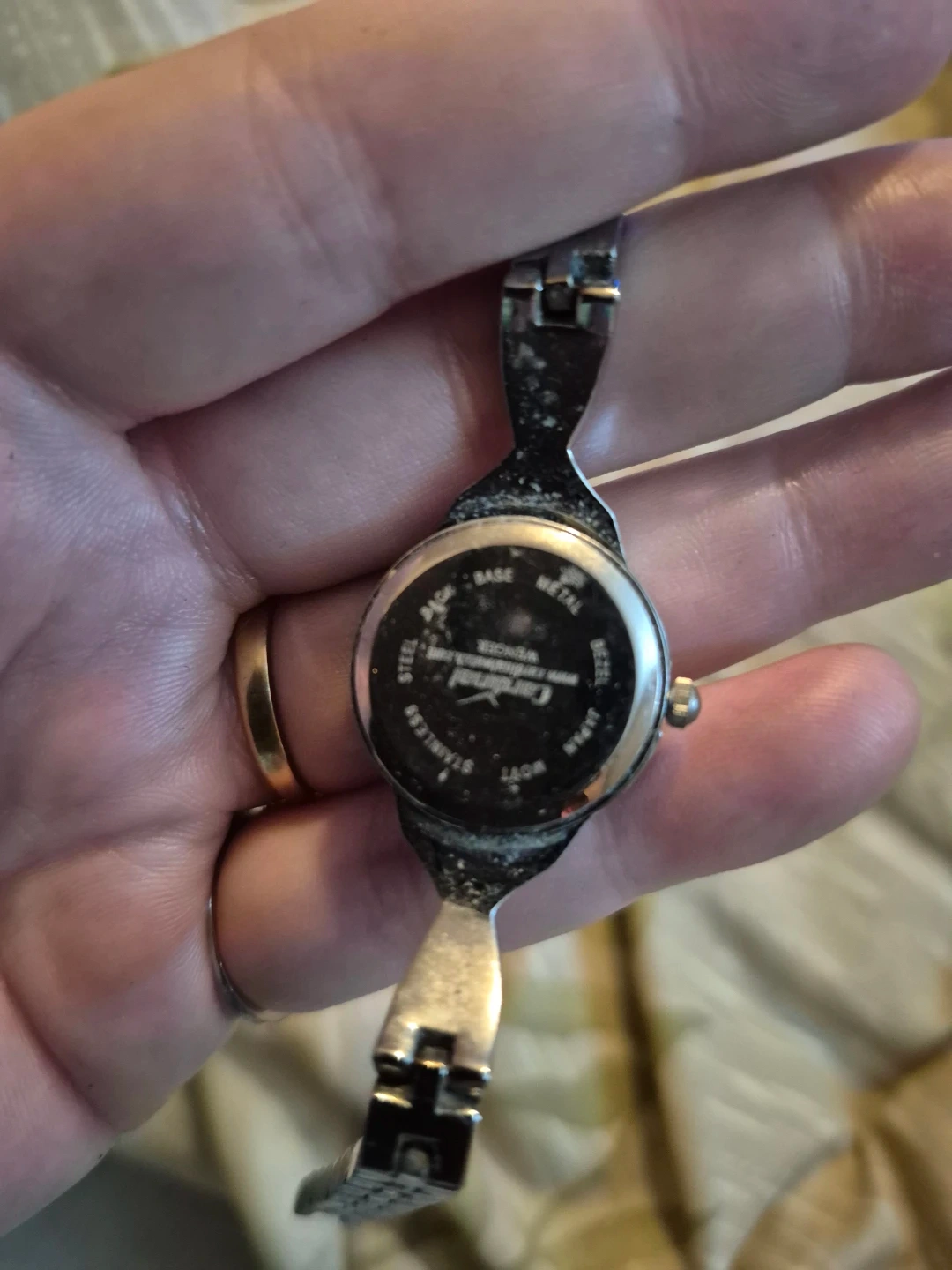 This Caprice women's watch features a quartz movement and a silver-tone metal band. The watch face is black with crystal accents along the band. It's a stylish accessory for everyday wear. Stainless steel case back. Will need a New Battery
