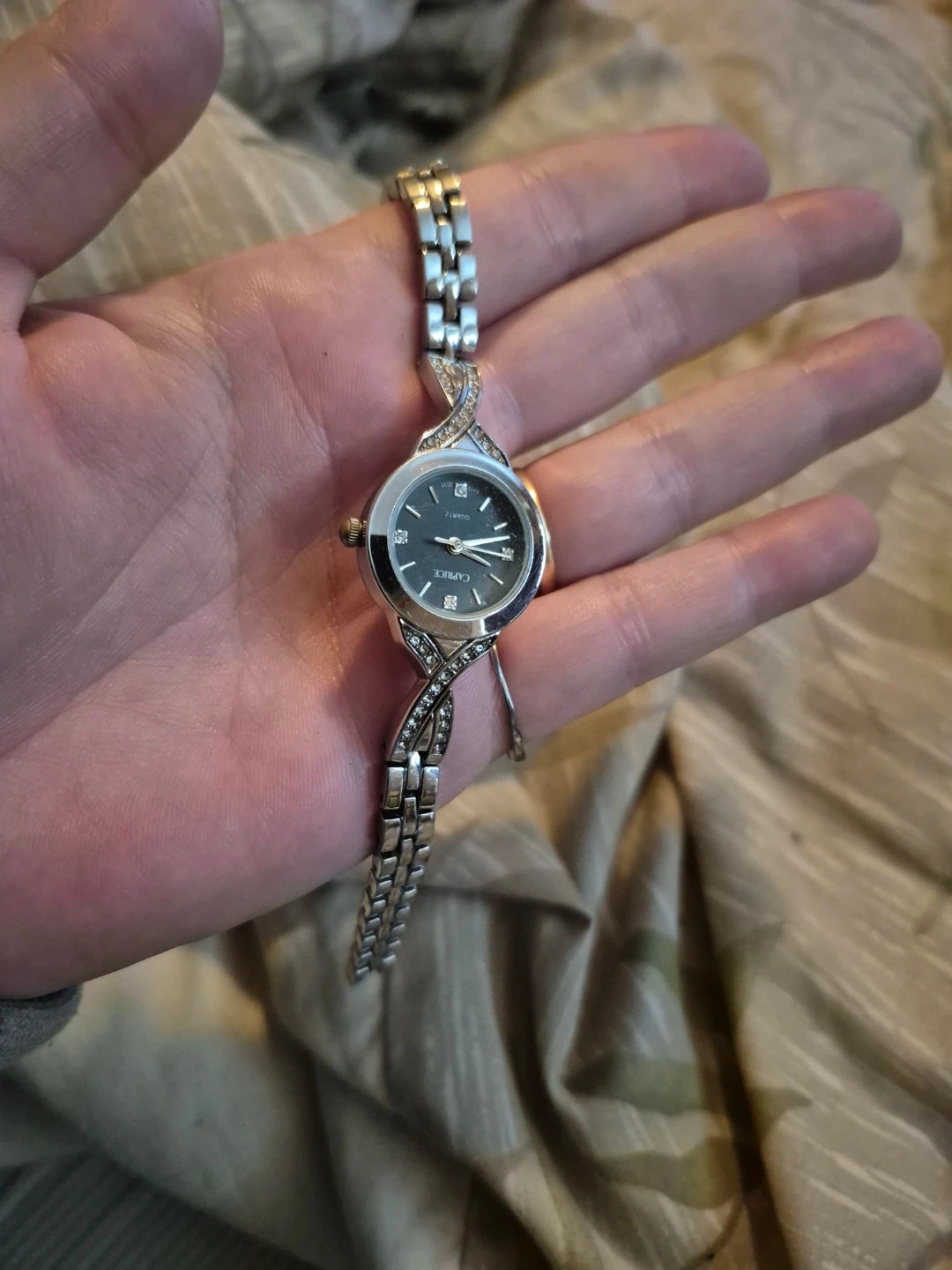 This Caprice women's watch features a quartz movement and a silver-tone metal band. The watch face is black with crystal accents along the band. It's a stylish accessory for everyday wear. Stainless steel case back. Will need a New Battery