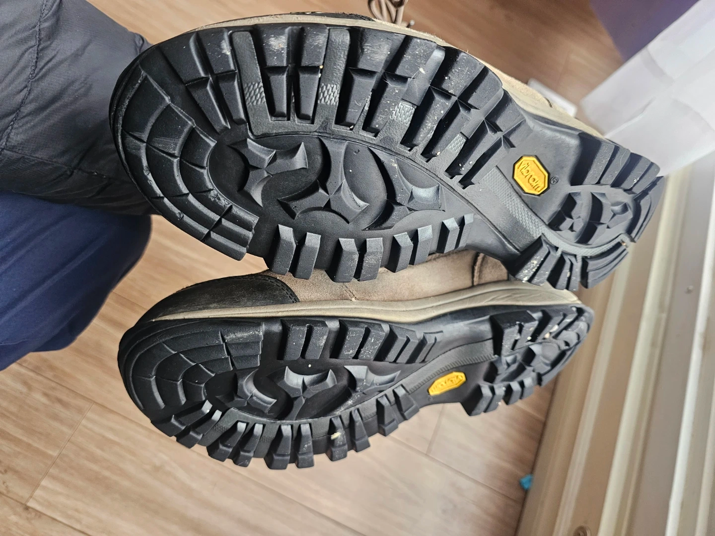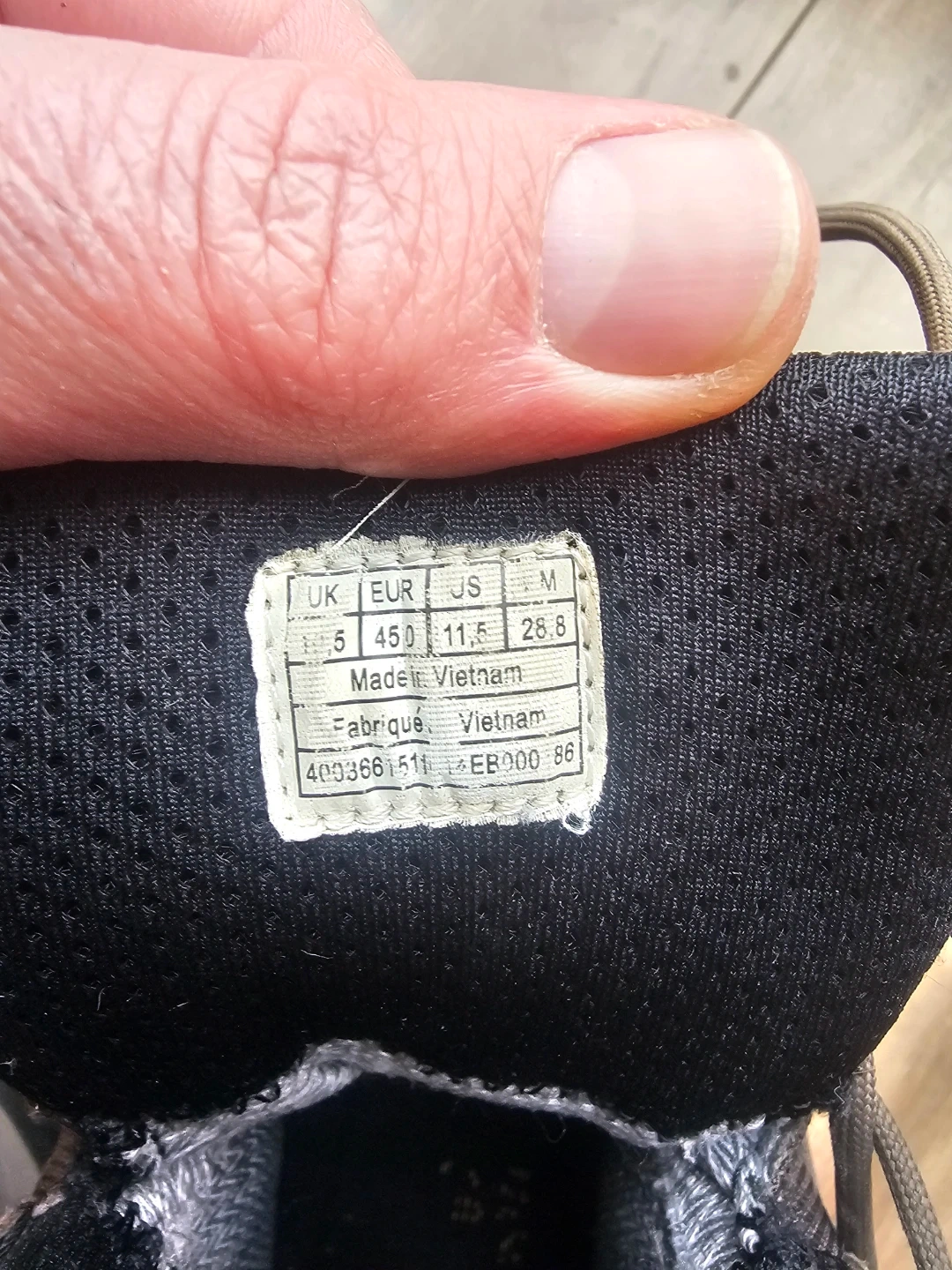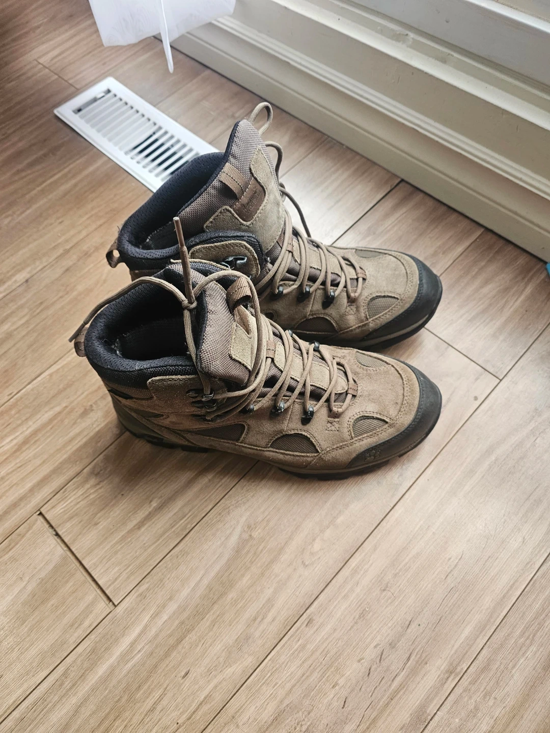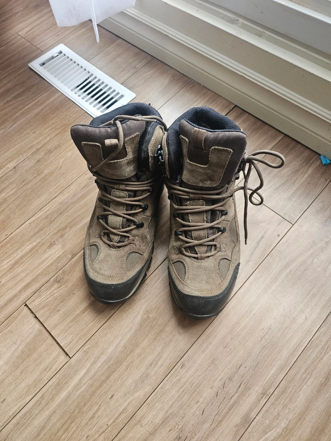 These brown hiking boots are a size US 11.5, EUR 45, UK 10.5. They're made with a durable tread for outdoor adventures. They are being used for a very short-term and they are in a good condition