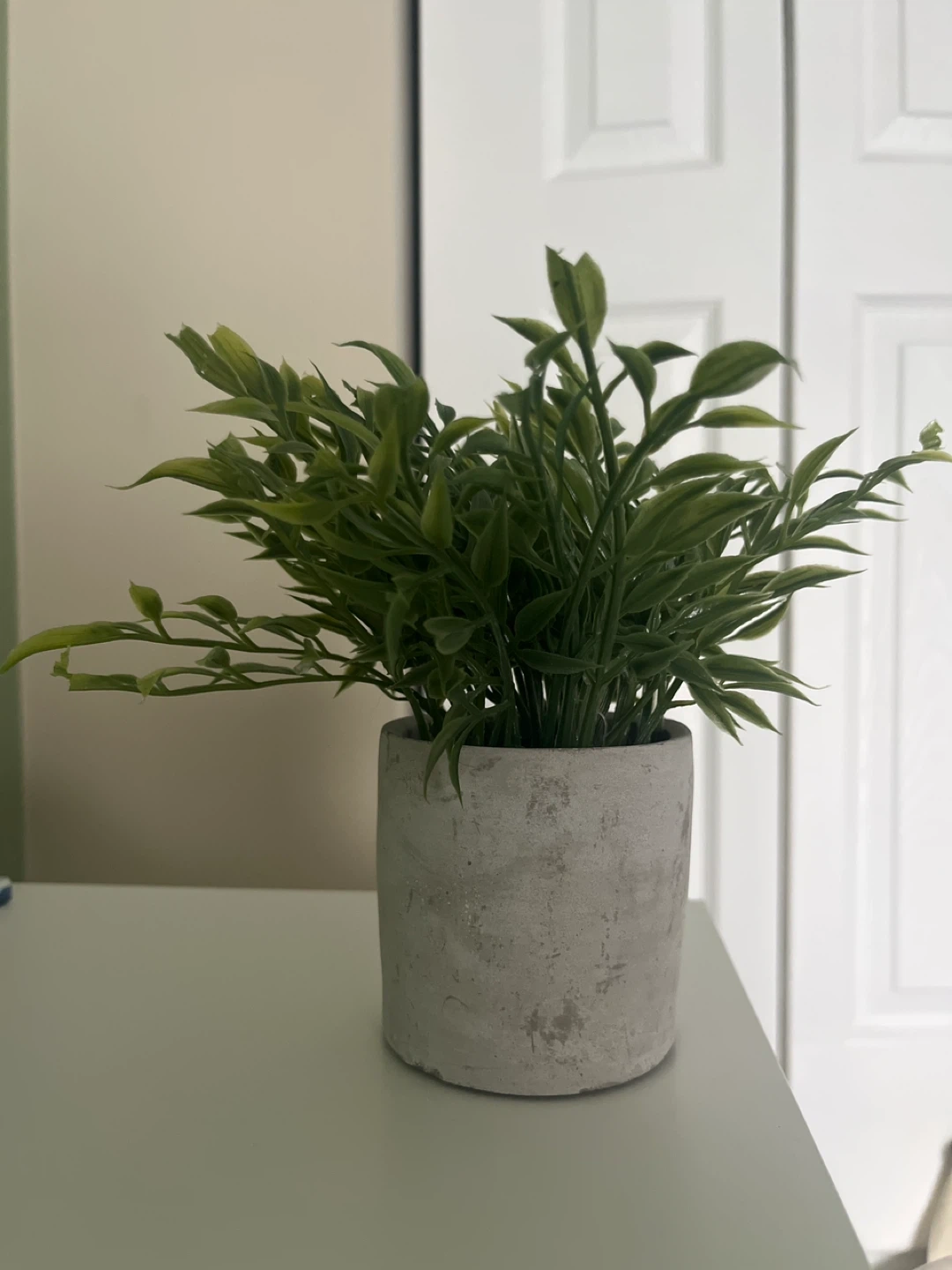 A lifelike artificial plant housed in a modern concrete pot. This plant requires no watering or maintenance, making it a hassle-free addition to any space. It's a great way to add a touch of greenery indoors.