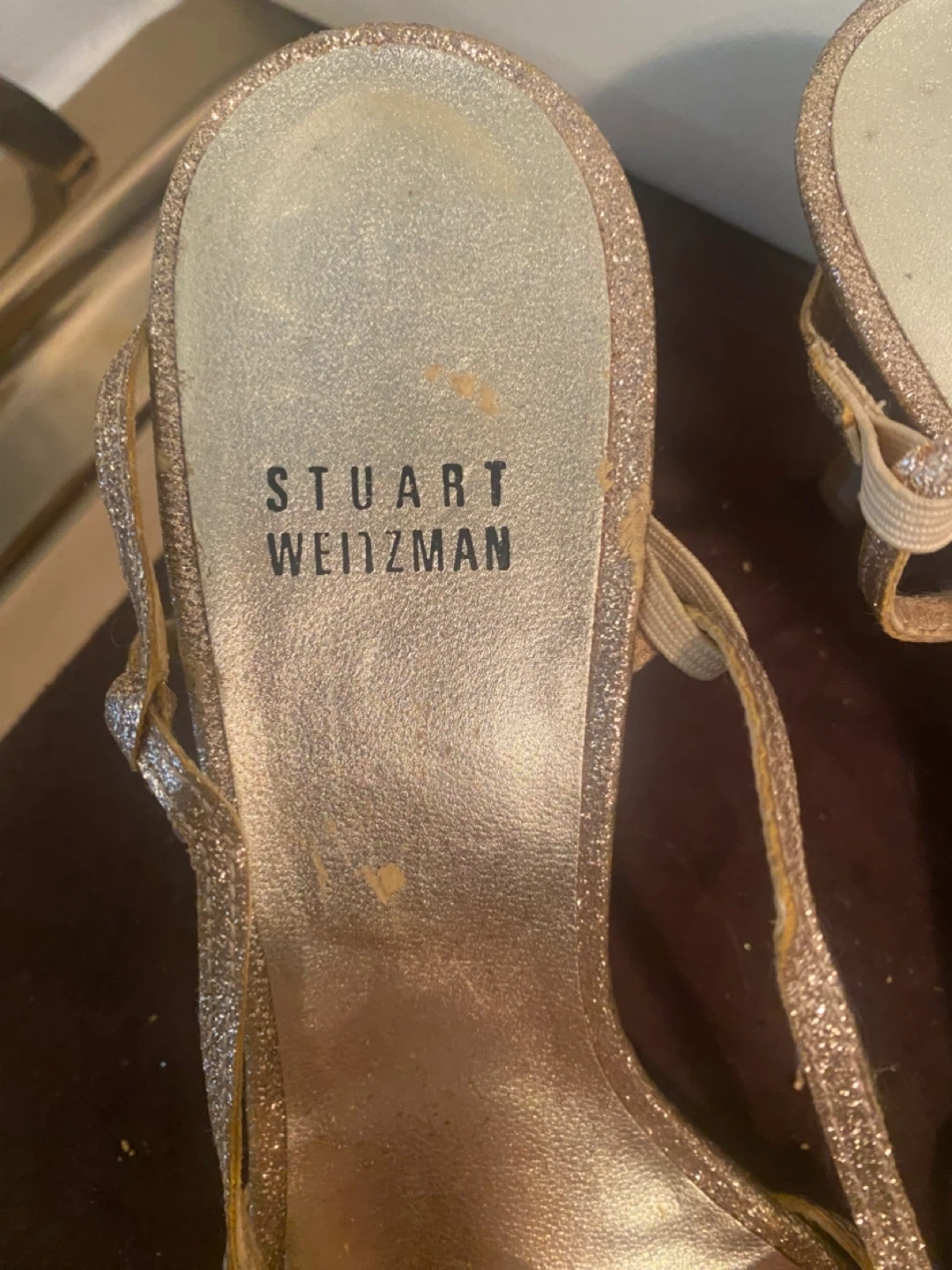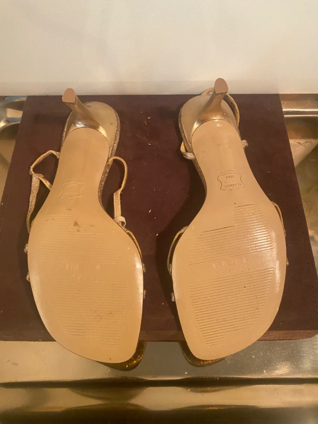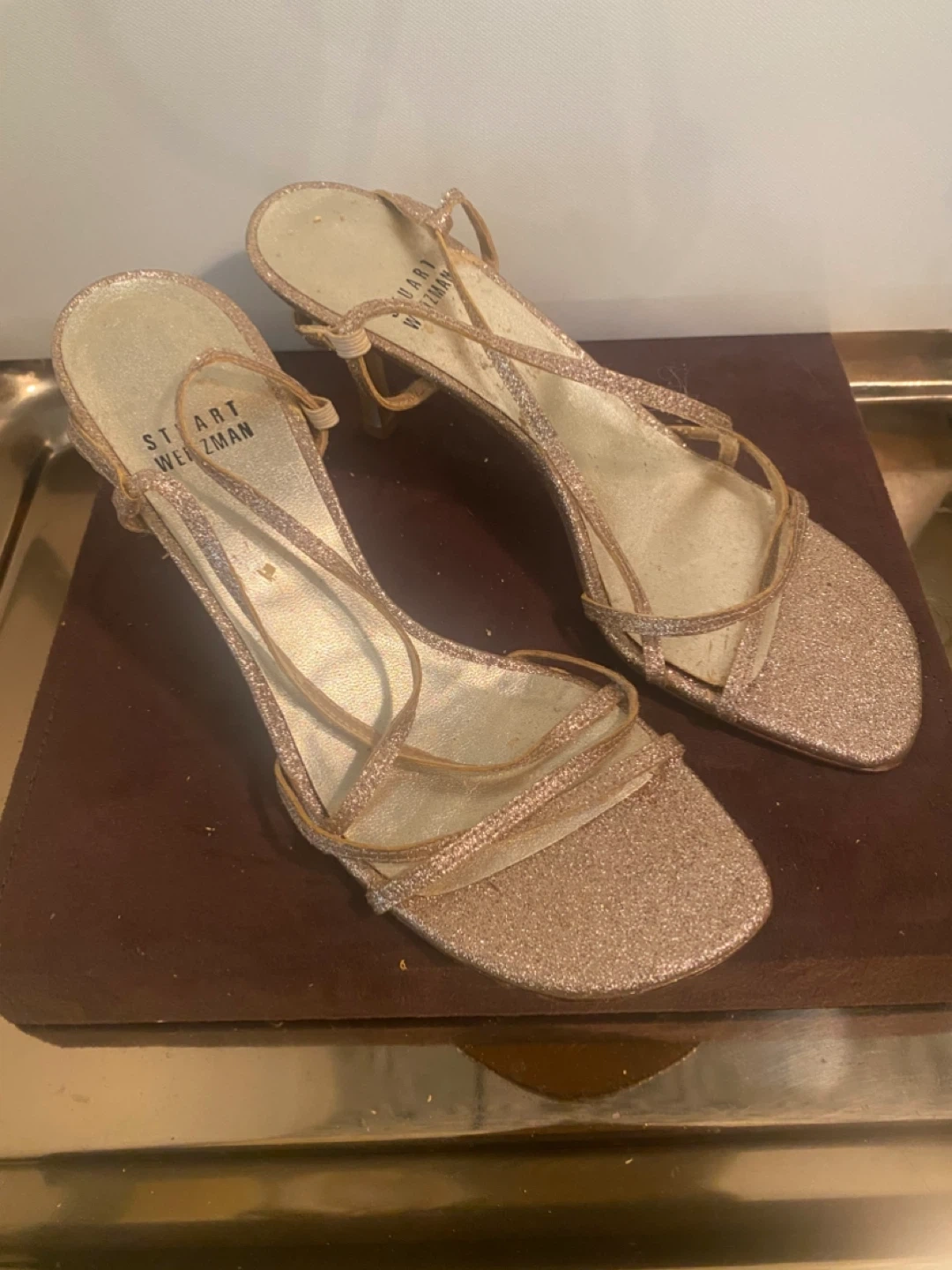 Sparkly Stuart Weitzman heeled sandals with a strappy design. These glittery shoes are perfect for dressing up any outfit. They feature a delicate ankle strap and a comfortable heel height.