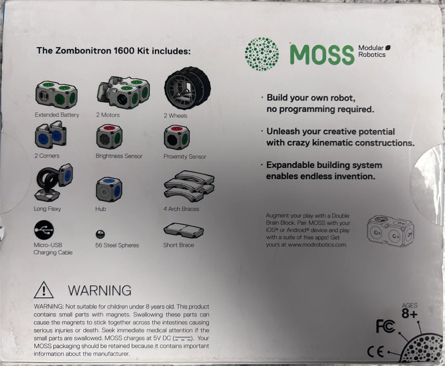 This MOSS Zombonitron 1600 kit lets you build your own robot with no programming required. It's an expandable building system that enables endless invention. The kit includes an extended battery, 2 motors, 2 wheels, 2 corners, a brightness sensor, a proximity sensor, a long flexy, a hub, 4 arch braces, a micro-USB charging cable, and 56 steel spheres.