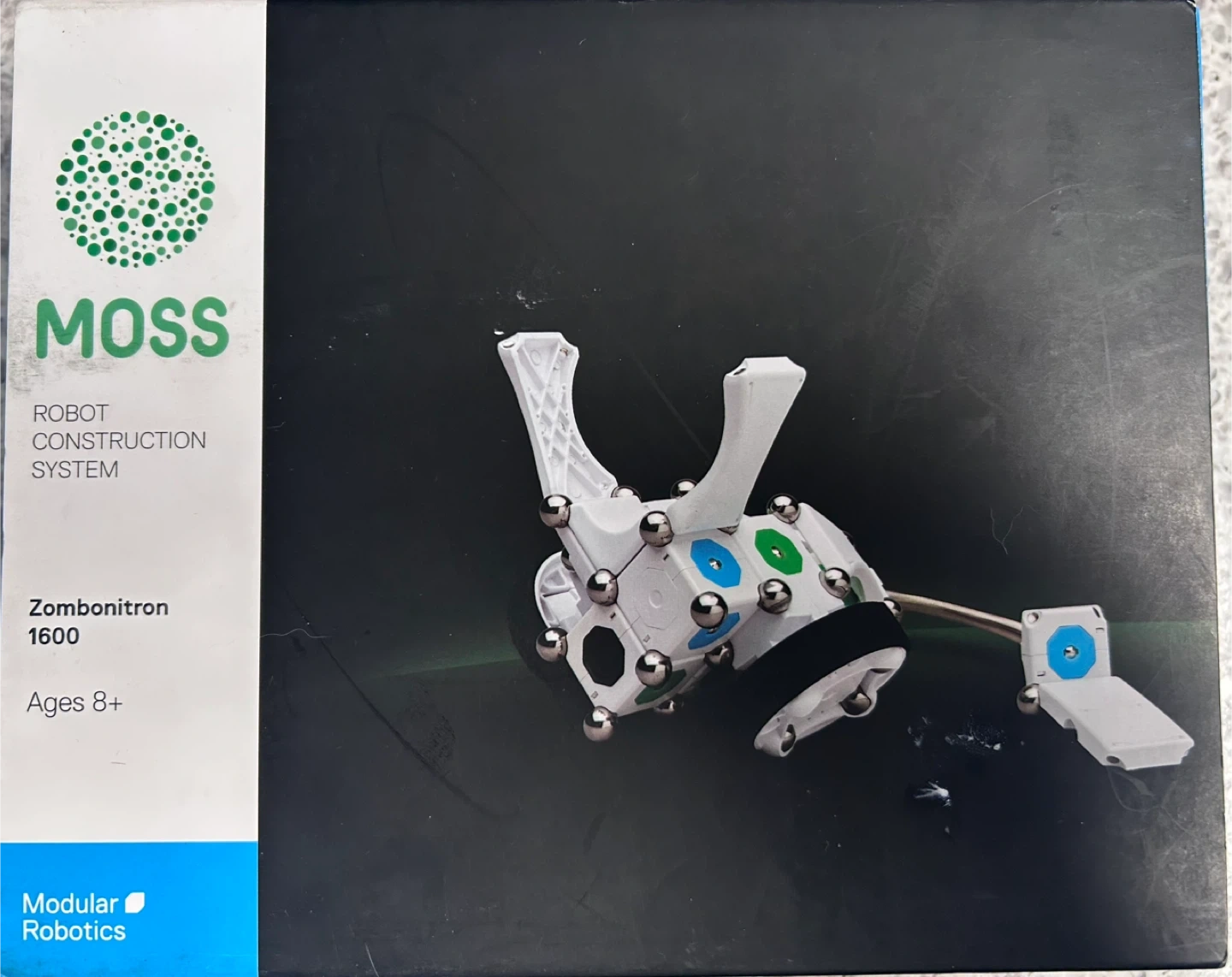 This MOSS Zombonitron 1600 kit lets you build your own robot with no programming required. It's an expandable building system that enables endless invention. The kit includes an extended battery, 2 motors, 2 wheels, 2 corners, a brightness sensor, a proximity sensor, a long flexy, a hub, 4 arch braces, a micro-USB charging cable, and 56 steel spheres.