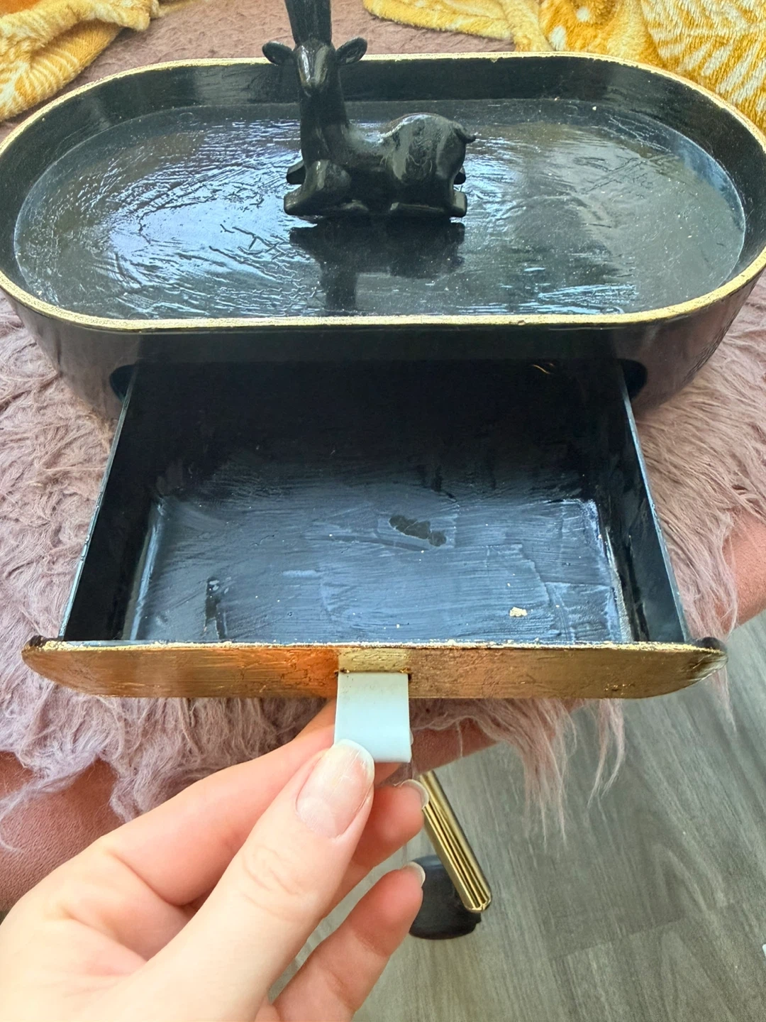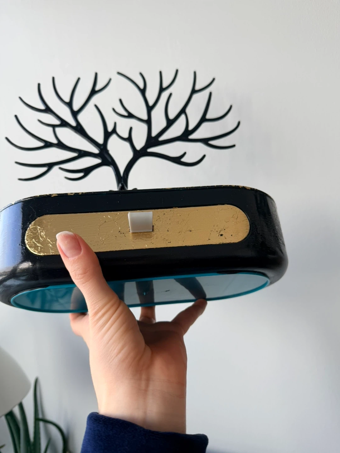 Decorative jewelry organizer with a tree branch design for hanging necklaces and earrings. Features a small pull-out drawer for storing rings or other small items. Black and gold finish.