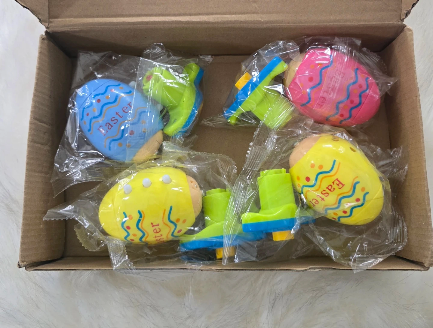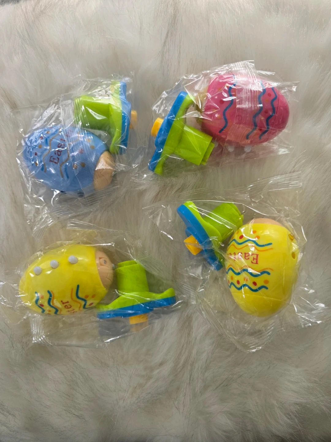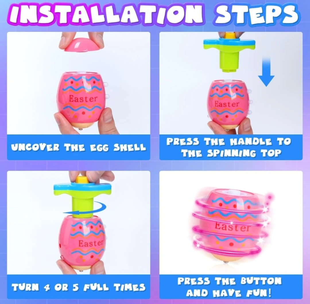 This set includes four colourful Easter egg spinners that light up and play music when spun! They're easy to assemble with the included handles. Great for Easter fun and playtime!