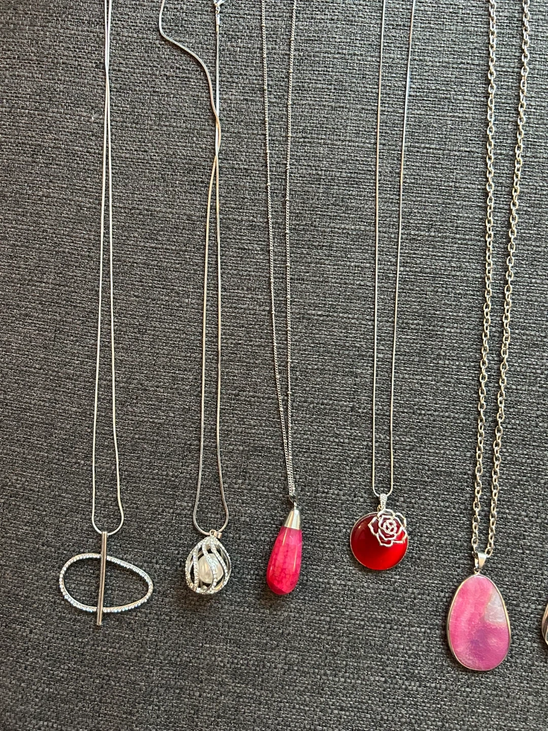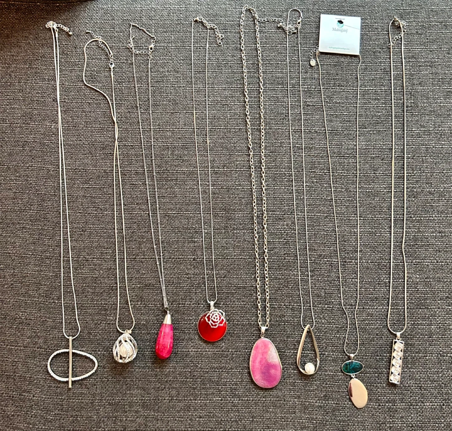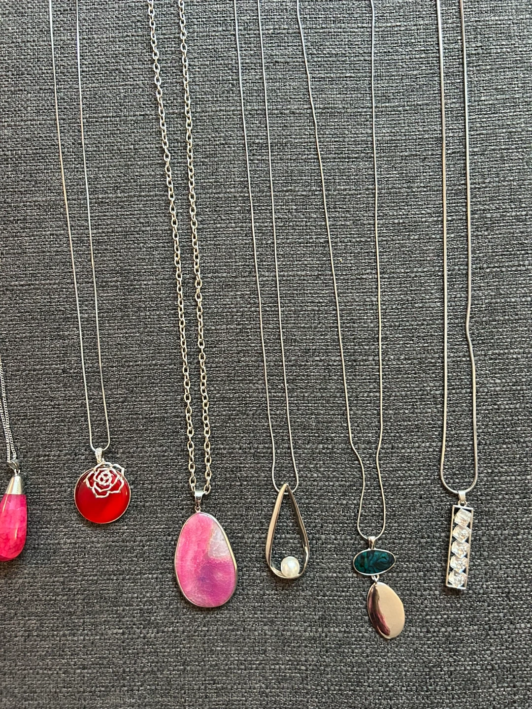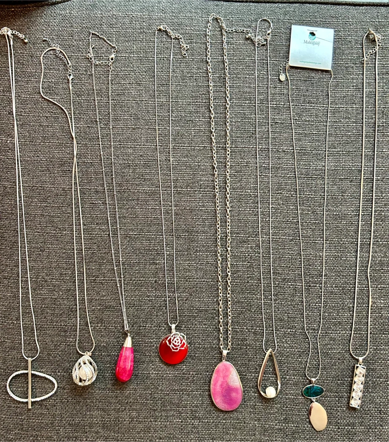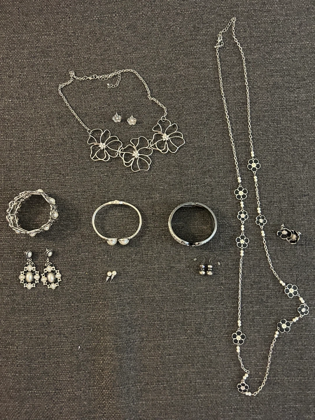 This lot includes a variety of women's costume jewelry. You'll find several necklaces with different pendants, bracelets, and matching earrings. Most pieces feature silver-tone metal with faux pearls and floral or abstract designs.