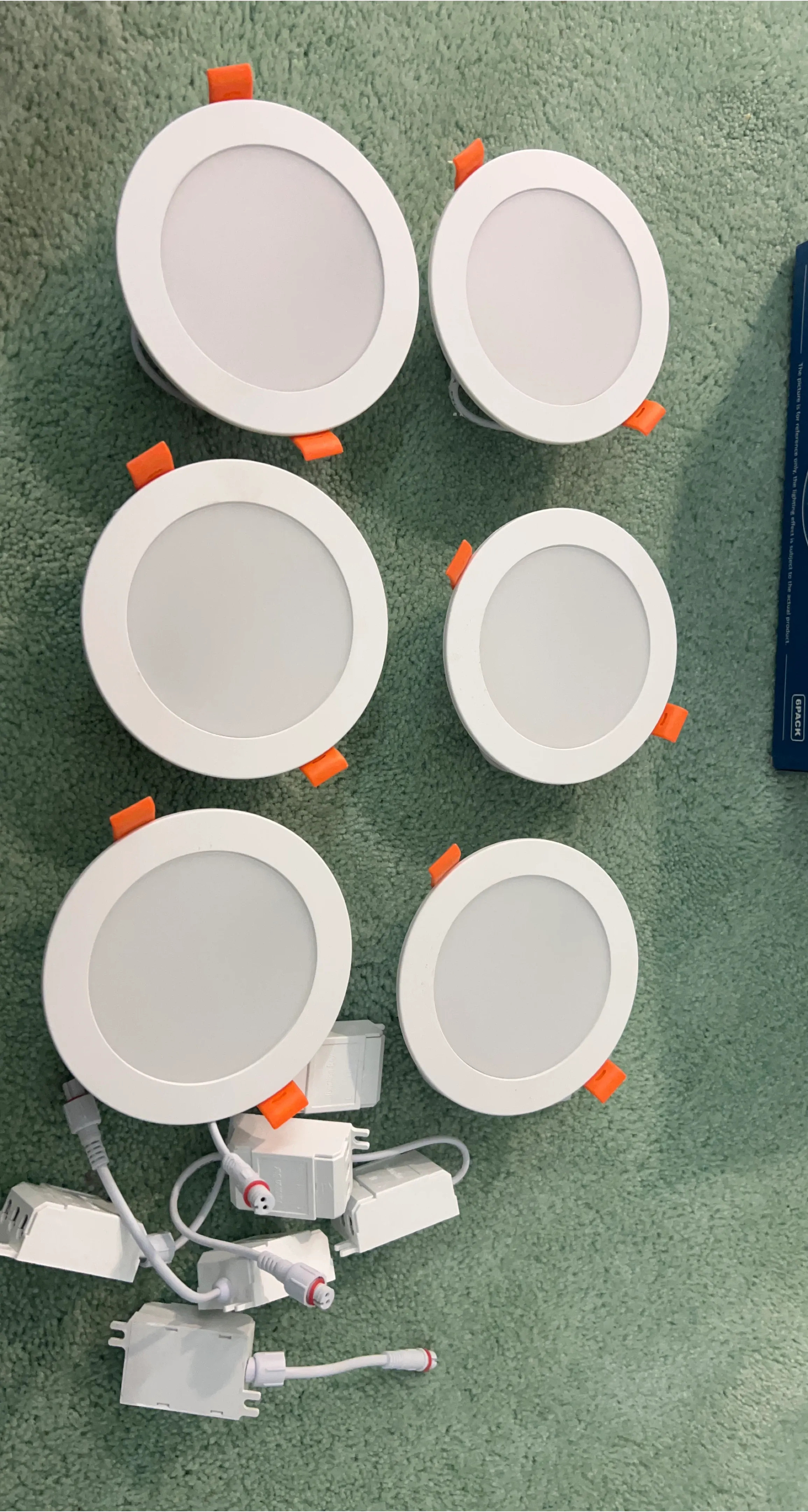 A set of six white round LED ceiling panel lights. Each light comes with its own driver. These lights are suitable for general room illumination.