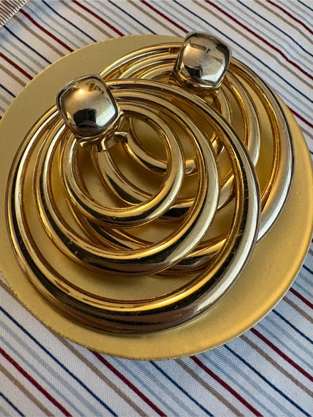 These striking gold tone vintage earrings feature a unique nested hoop design. The largest hoop measures approximately 2.5 inches in diameter, with several smaller hoops nested inside. They have post backs for secure wear. These earrings are perfect for making a statement with any outfit!