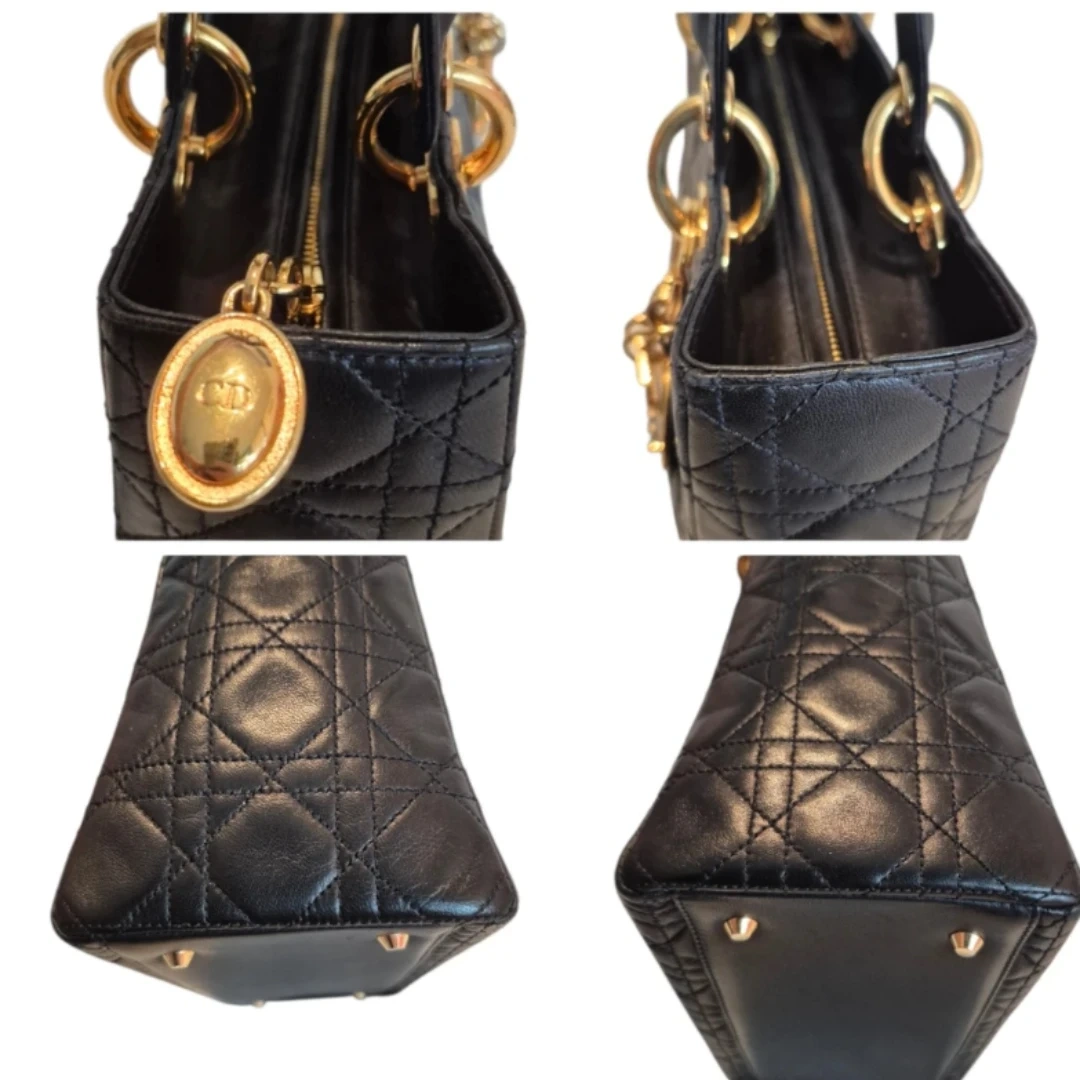 Features: Gold-finish metal D.I.O.R. charms. Medium Lady Dior bag can be carried by hand for timeless elegance. Vintage. Year 1997. Made in Spain.