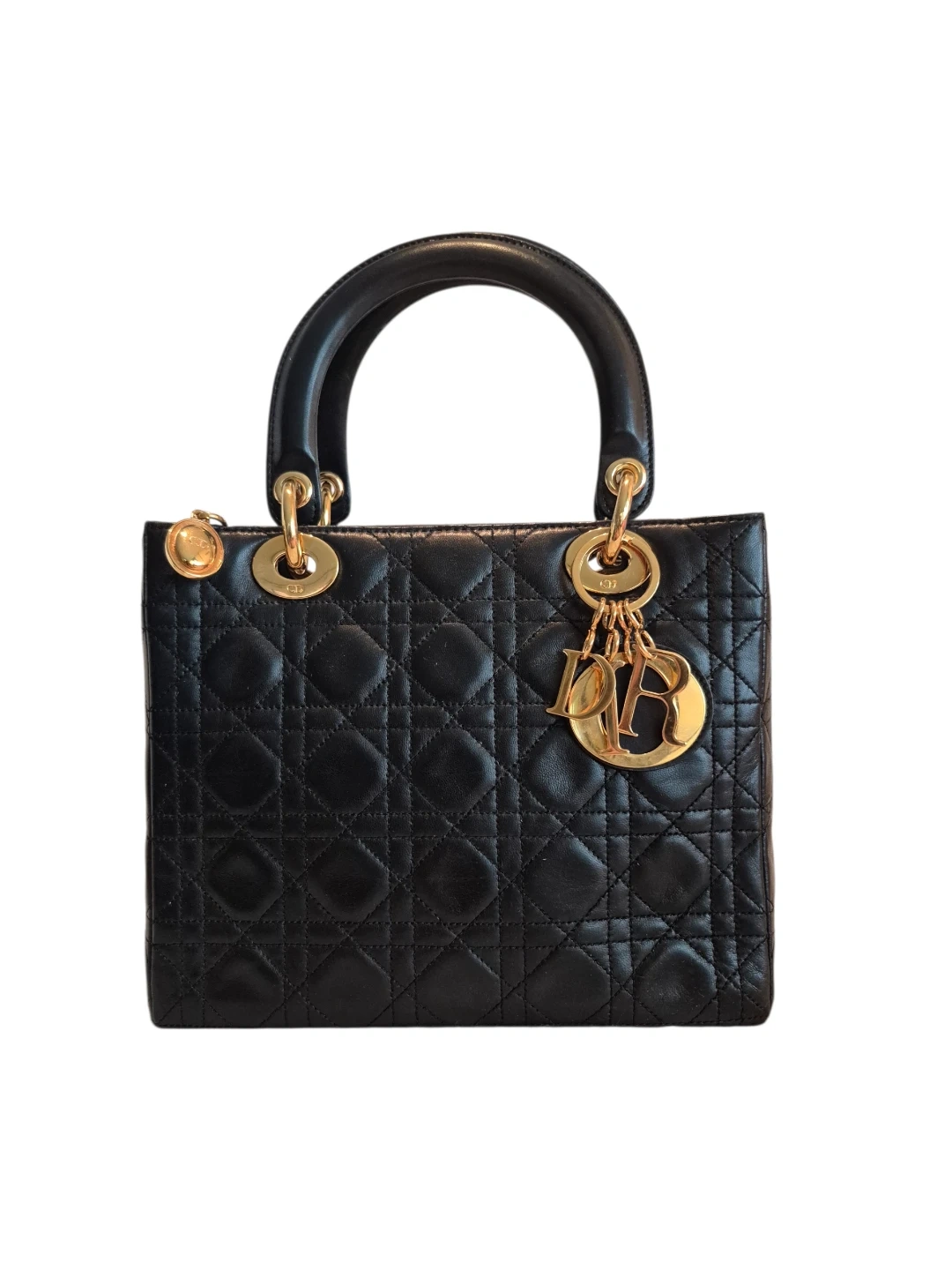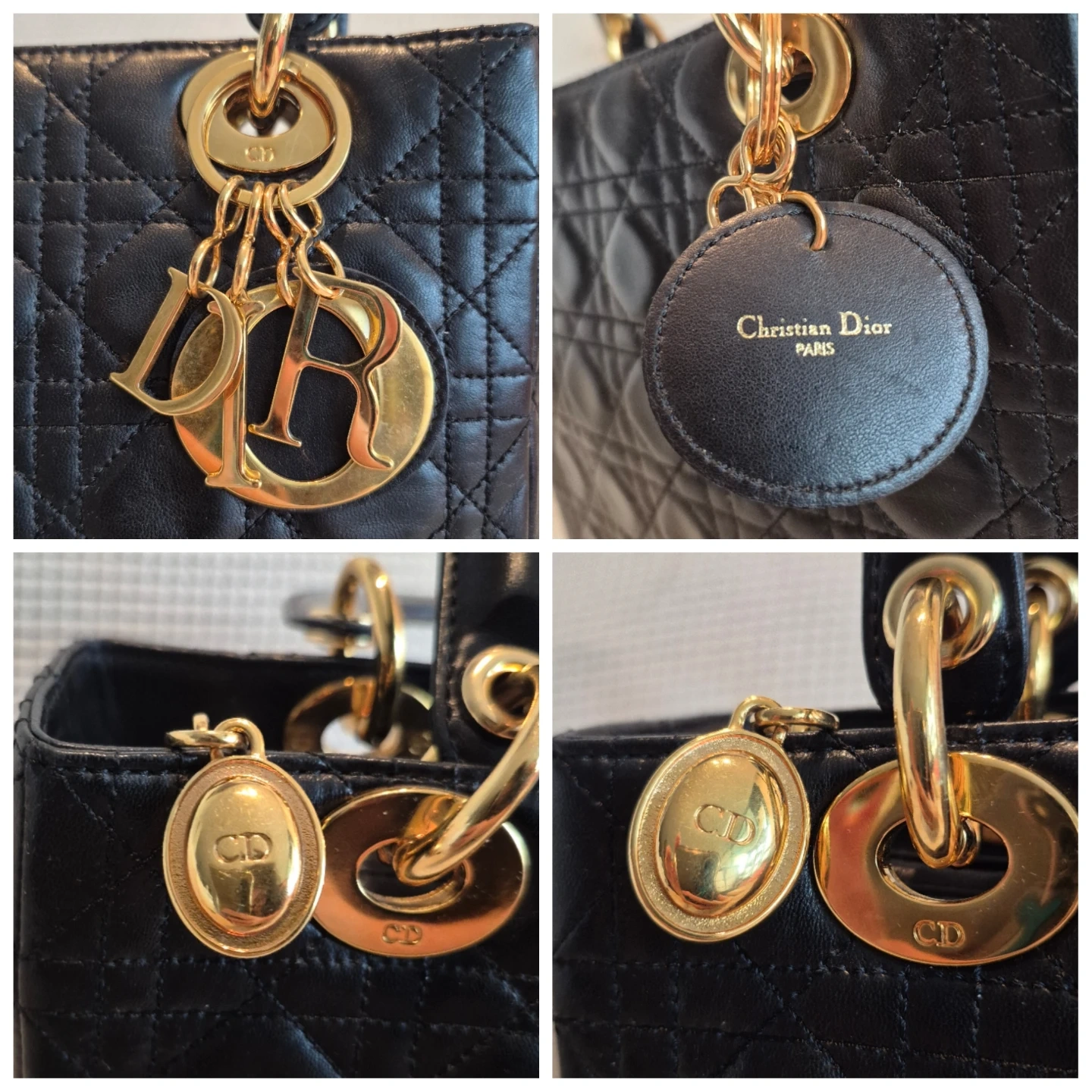 - Front Gold D.I.O.R. charms with Black leather tag stamped Christian Dior on back.