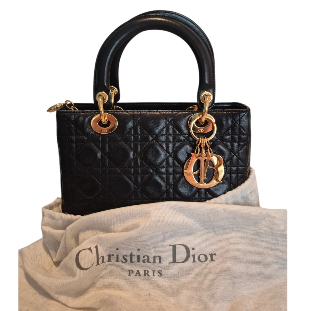 Features: Gold-finish metal D.I.O.R. charms. Medium Lady Dior bag can be carried by hand for timeless elegance. Vintage. Year 1997. Made in Spain.