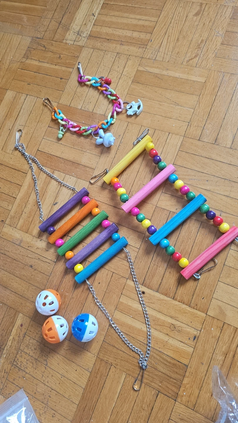 This set includes a colourful wooden ladder swing and a chain with dangling toys. Also includes three chew balls for your bird's enrichment. Great for parrots and other small birds! New . Cash only
