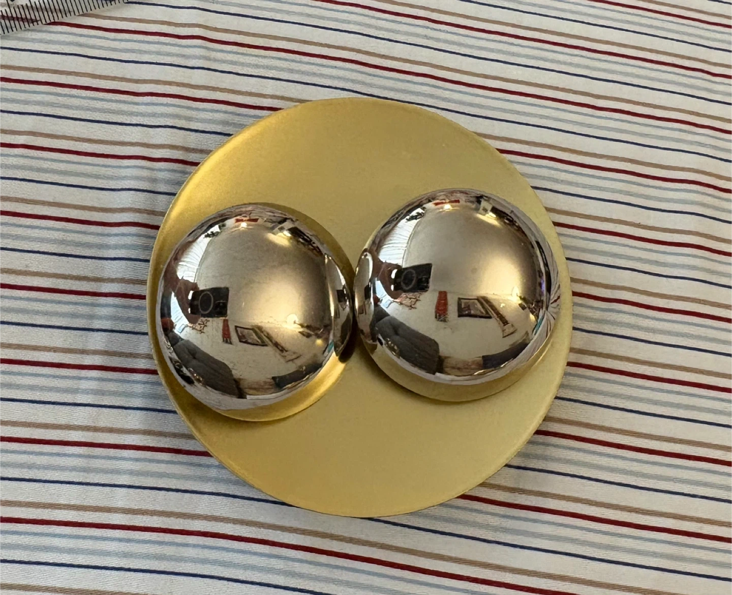 This is a vintage set of two shiny silver spheres mounted on a round ear ring. . Each sphere has a polished, reflective surface. Stylish:)