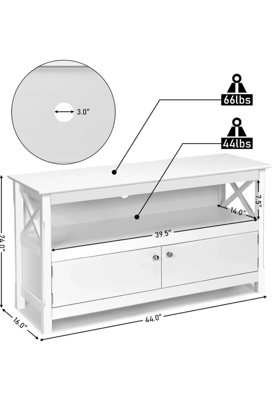 White TV stand with two cabinets and open shelving. Measures 44.0" wide, 16.0" deep, and 24.0" high. The open shelf is 39.5" wide and 14.0" deep. It can support up to 66 lbs on top and 44 lbs on the shelf. Offers ample storage space for media consoles or decor.