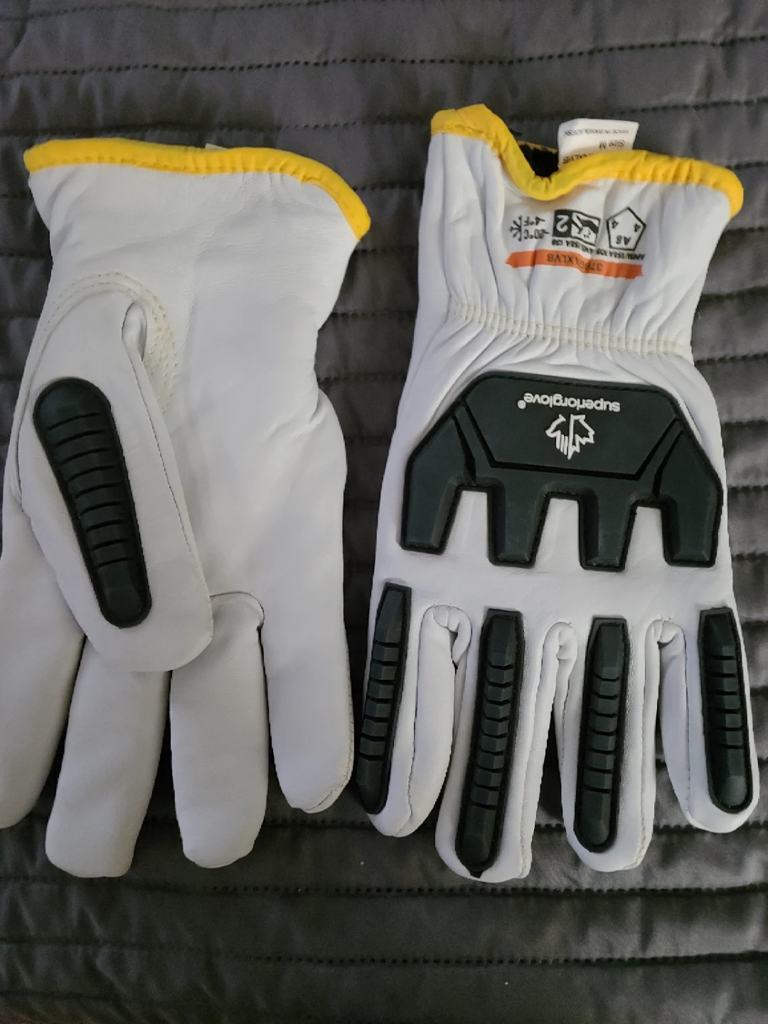 These SuperGlove work gloves are size medium. They're made of leather with reinforced knuckle protection. Ideal for construction or general labour!