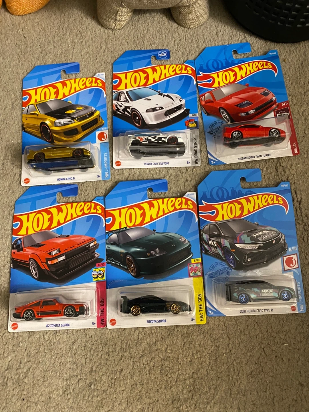 Selling a collection of JDM Hot Wheels diecast cars. Includes '82 Toyota Supra, Honda Civic Si, Honda Civic Custom, Toyota Supra, Nissan 300ZX Twin Turbo, and 2018 Honda Civic Type R. $ 10.00. Buy more $8.00