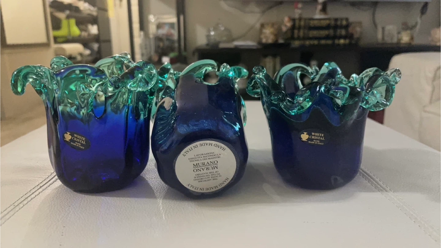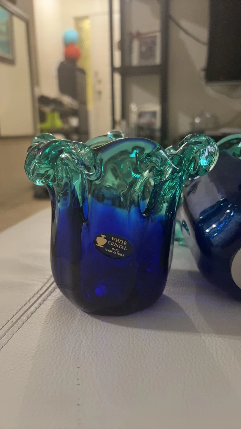 $20 each. Beautiful Murano glass vase, handmade in Italy. This piece showcases the technique of the masters. Its vibrant blue and green swirl design would make a lovely decorative accent.