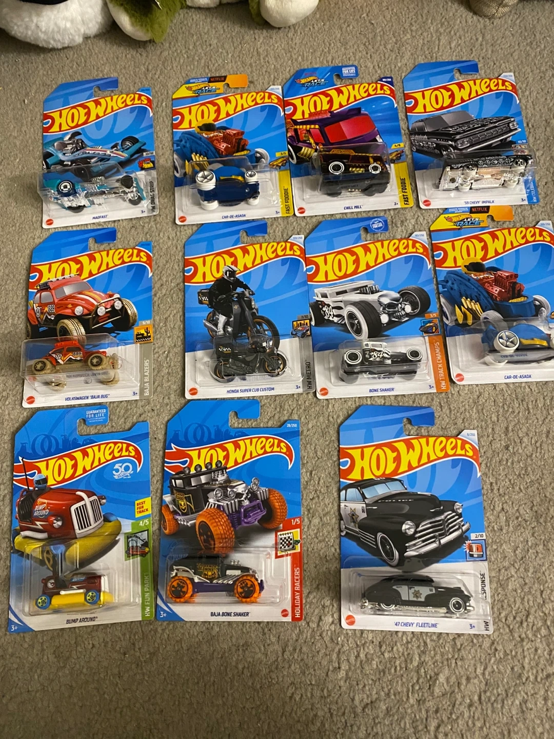 Treasure Hunts, Includes models like '47 Chevy Fleetline', 'Baja Bone Shaker', and 'Volkswagen Baja Bug'.