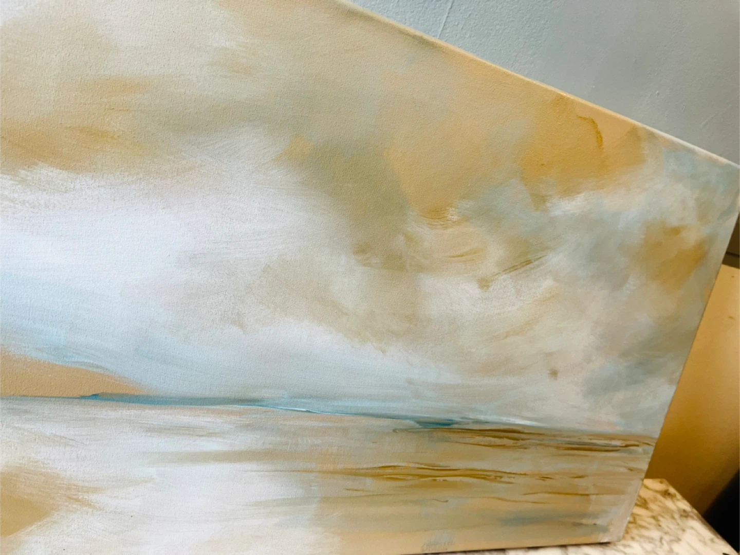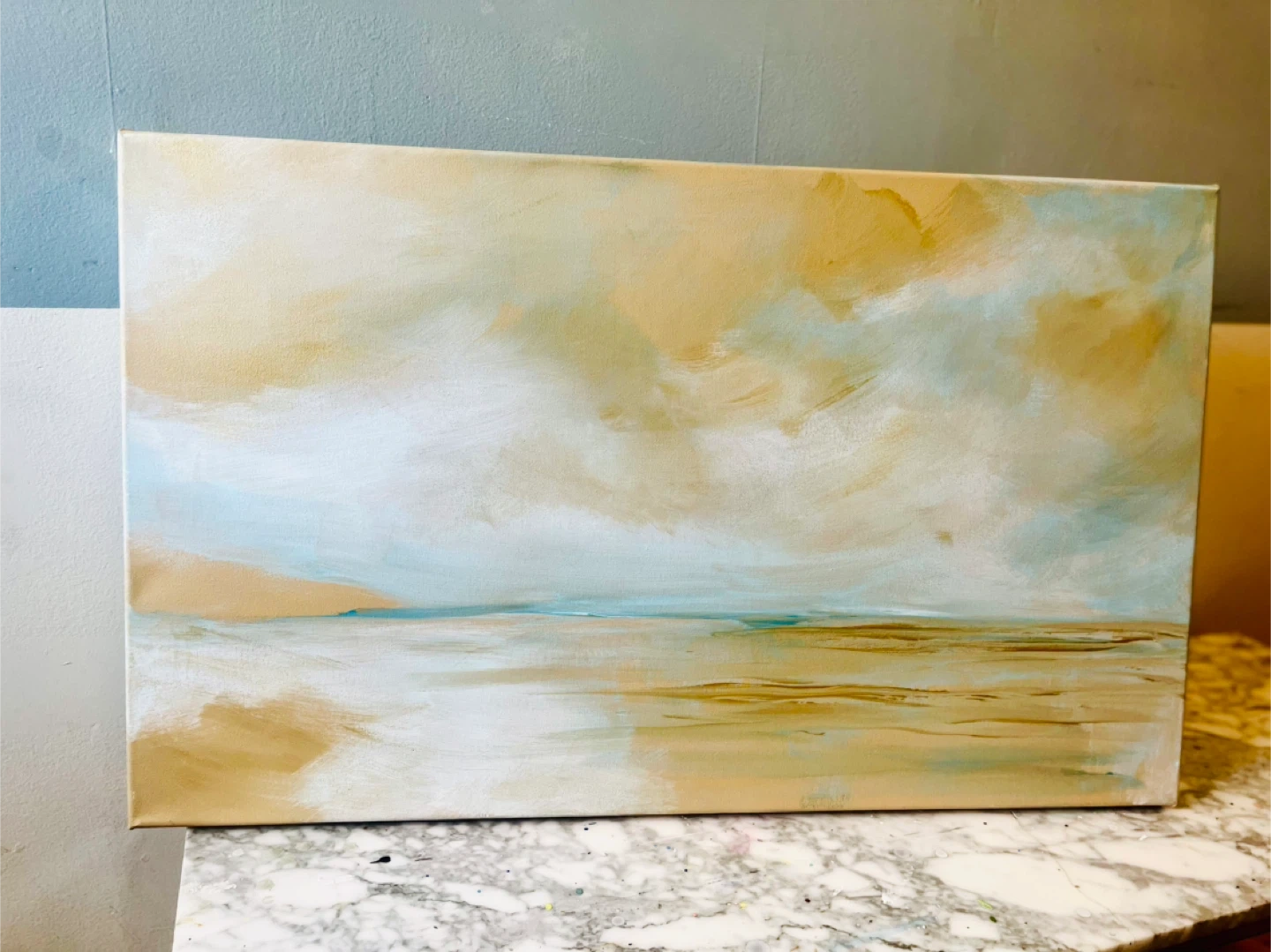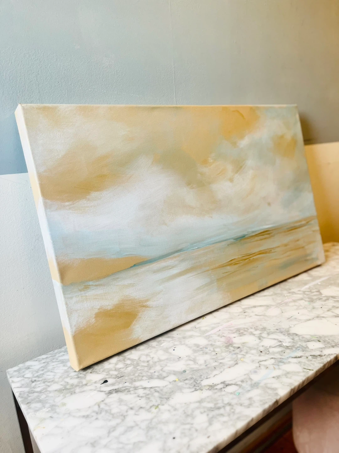 Beautiful abstract landscape painting on canvas 20x33”. It features soft, earthy tones with blues and whites, evoking a serene scene. This piece is ready to hang and would complement any room.