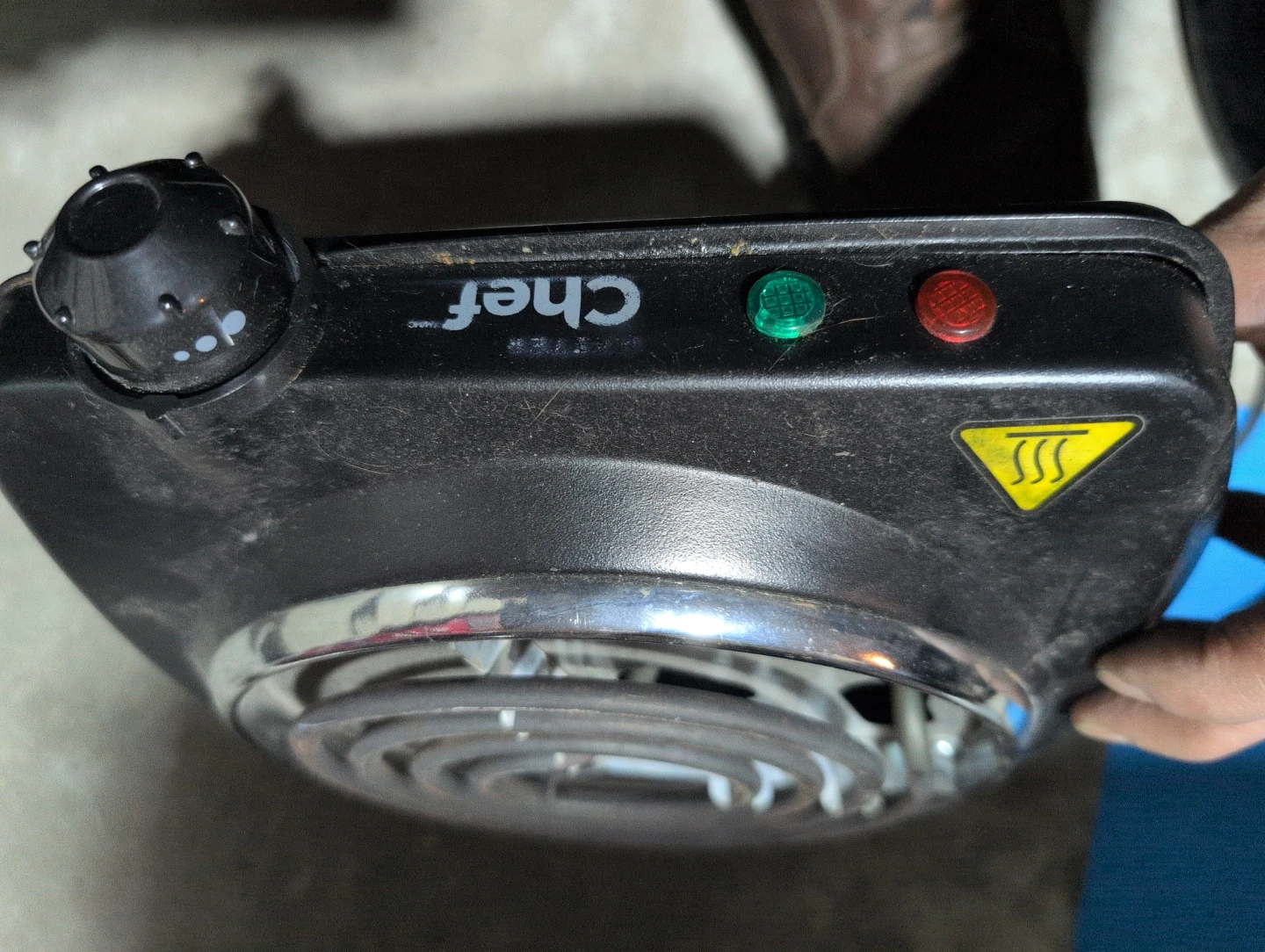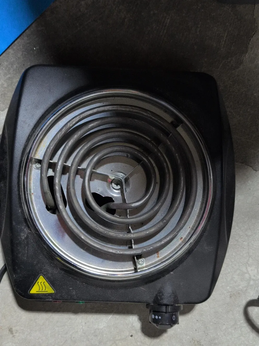 This Master Chef portable electric coil burner is a handy kitchen appliance. It features a single coil heating element and adjustable temperature control. Great for dorm rooms or small kitchens!