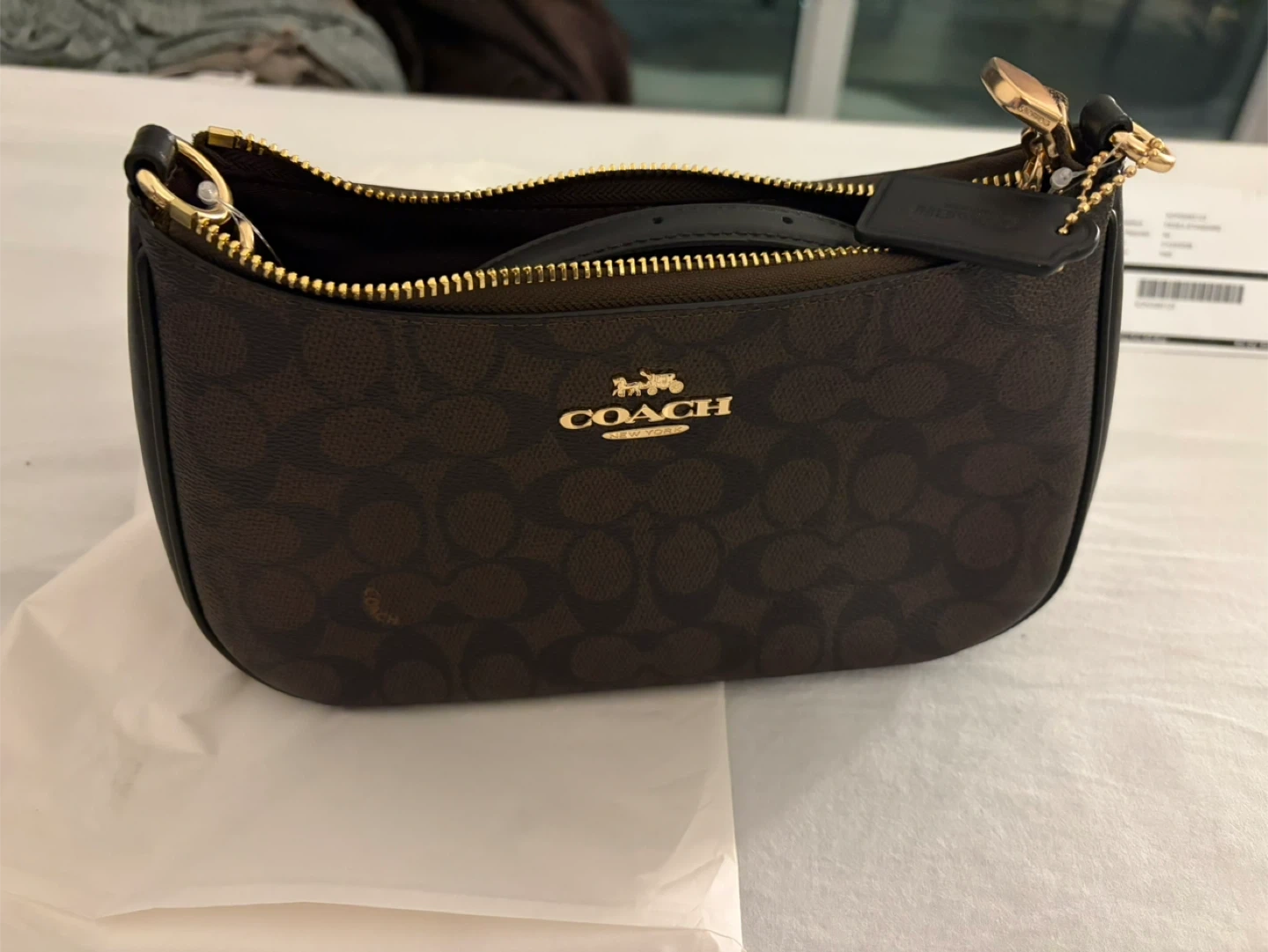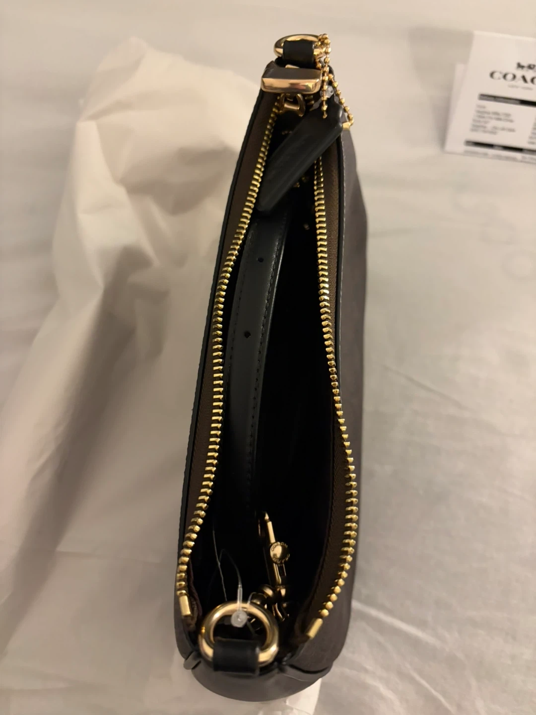 This is a Coach signature monogram wristlet bag. It features a zip-top closure and a leather trim. It's perfect for carrying your essentials when you're on the go!