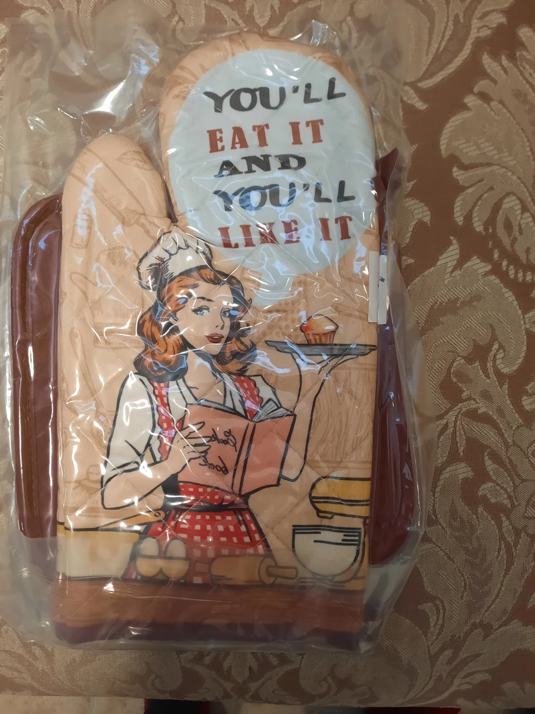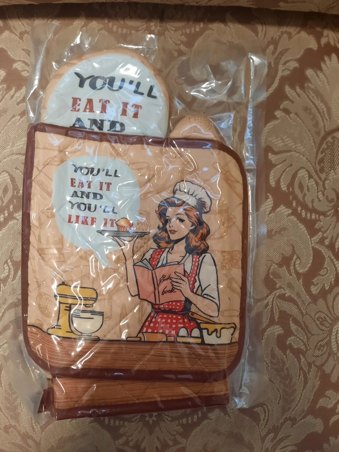 Quilted oven mitt and pot holder featuring a retro chef graphic. Text reads 'You'll eat it and you'll like it!'. Great for protecting your hands from heat in the kitchen.